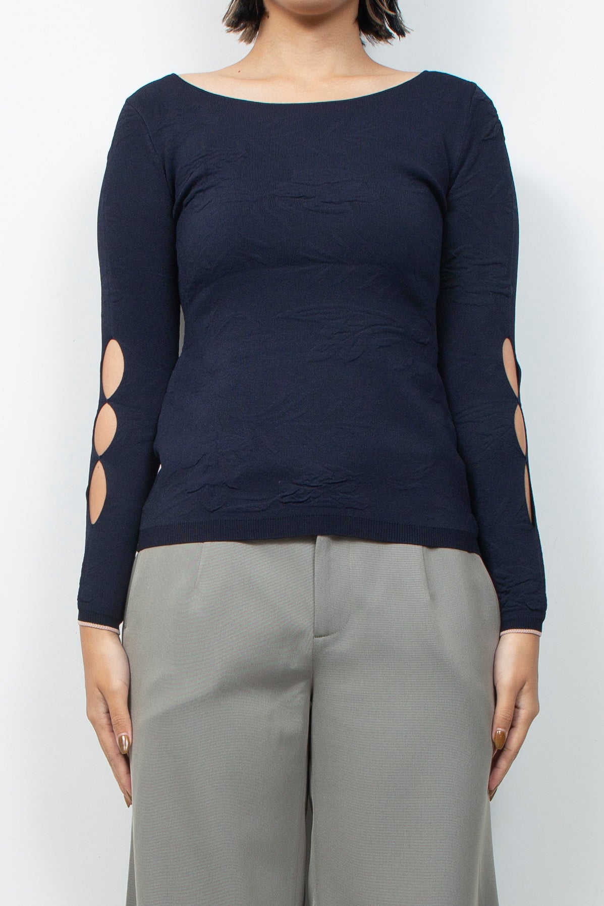 袖のスリットが上品な印象のニットトップス。立体的なボタニカル柄をニットで表現しており、控えめながらもしっかりと他とは違う上質感のある仕上がりに。