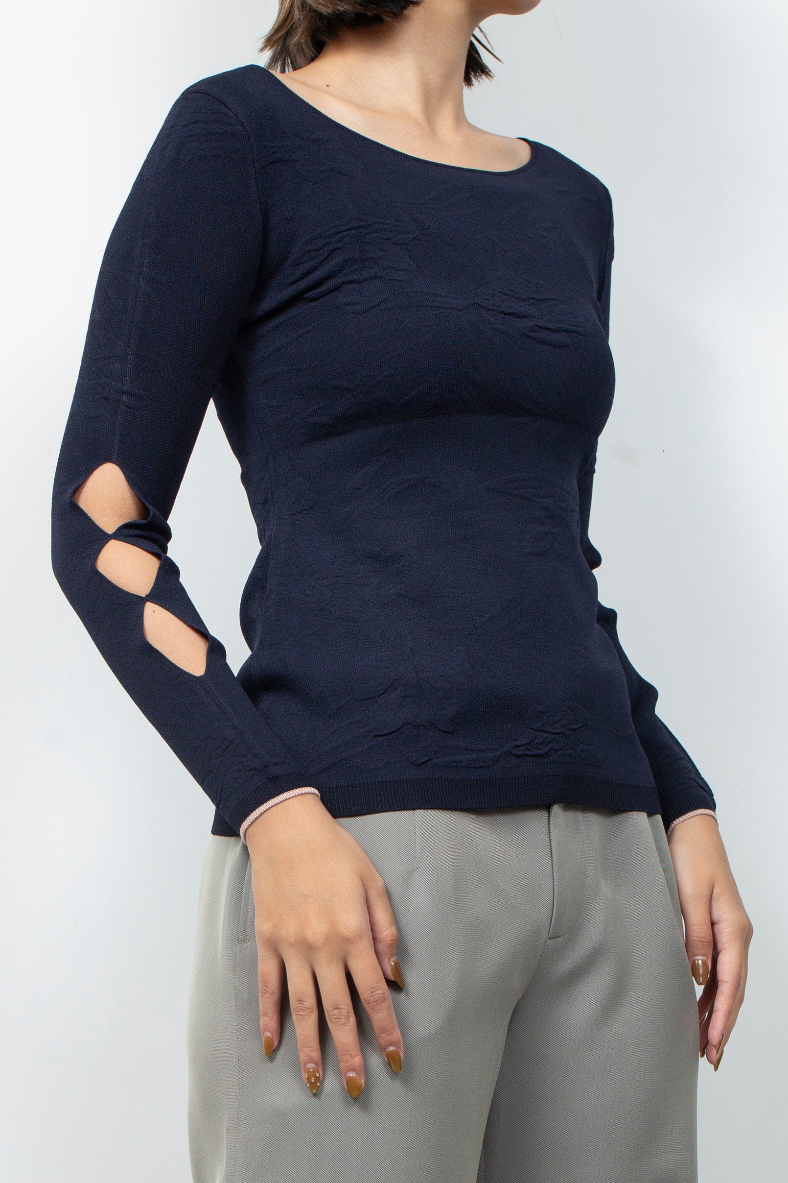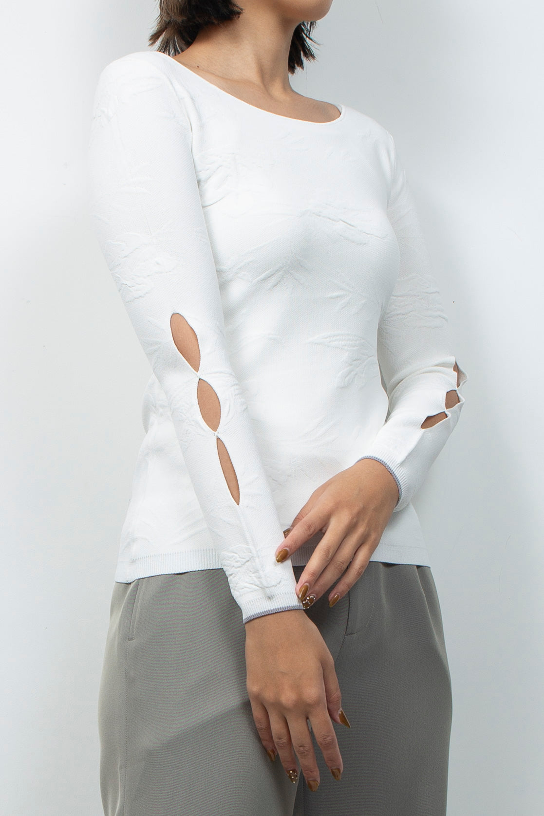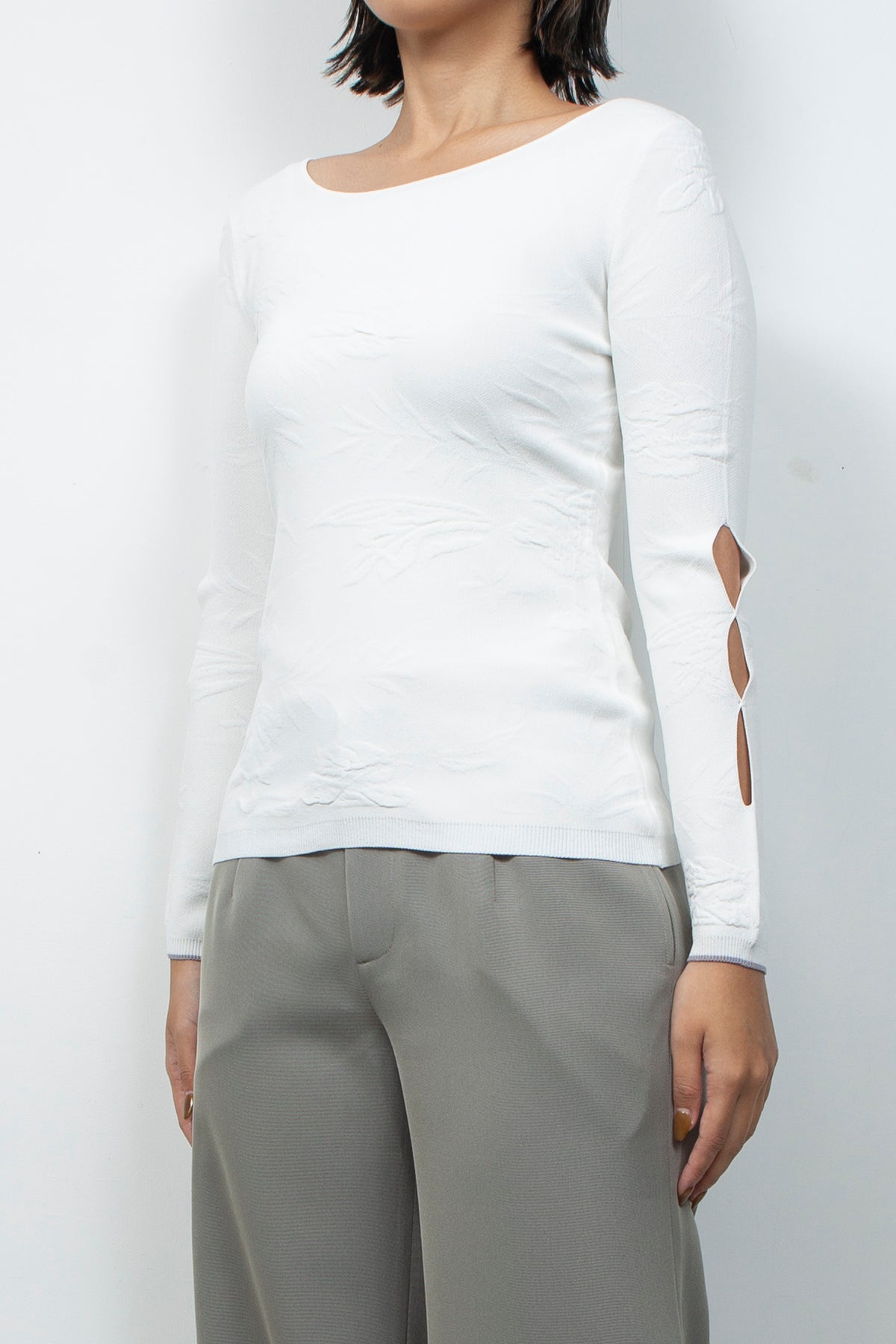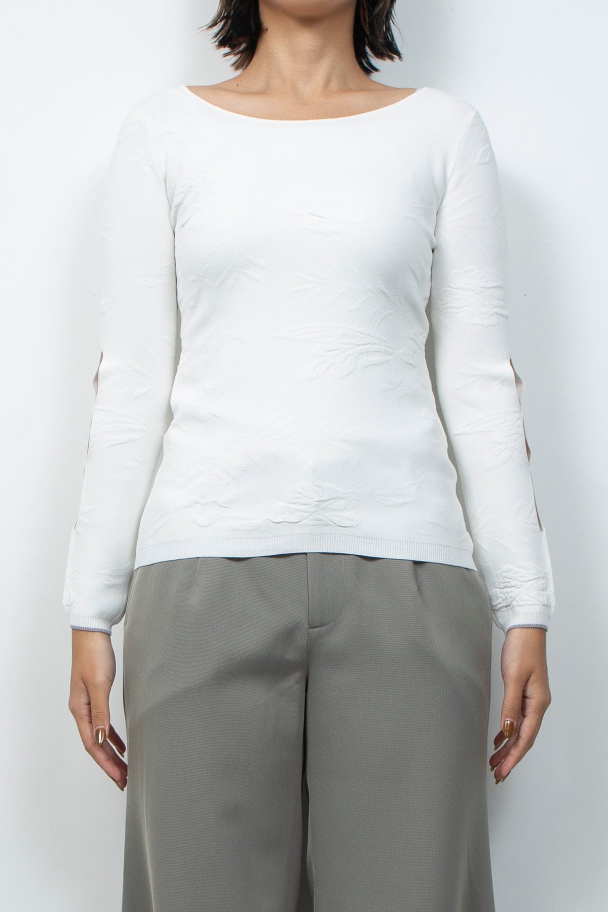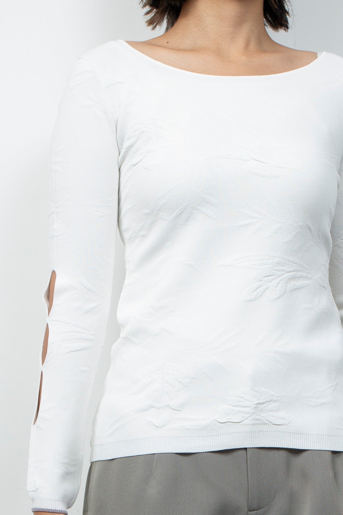 袖のスリットが上品な印象のニットトップス。立体的なボタニカル柄をニットで表現しており、控えめながらもしっかりと他とは違う上質感のある仕上がりに。