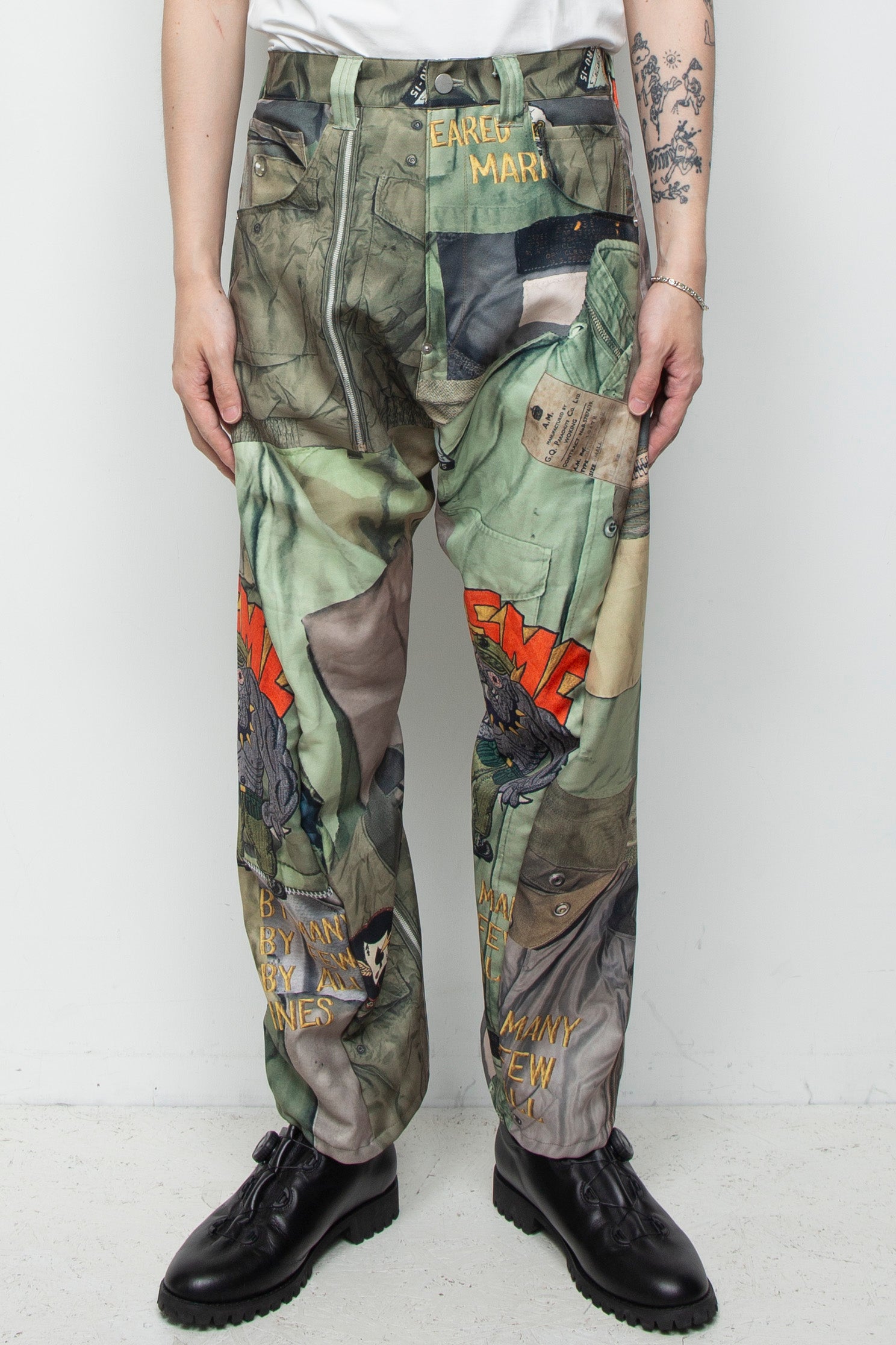 ヴィンテージデニム、ワッペン、 ピンバッジ、ミリタリーウエアなどをコラージュしたプリント生地を使用し、トロンプルイユ (だまし絵)のような遊び心のあるデザインに仕上げました。洗練されたシルエットと、遊び 心のあるデザインが融合した、唯一無二の存在感を放つ一本です。