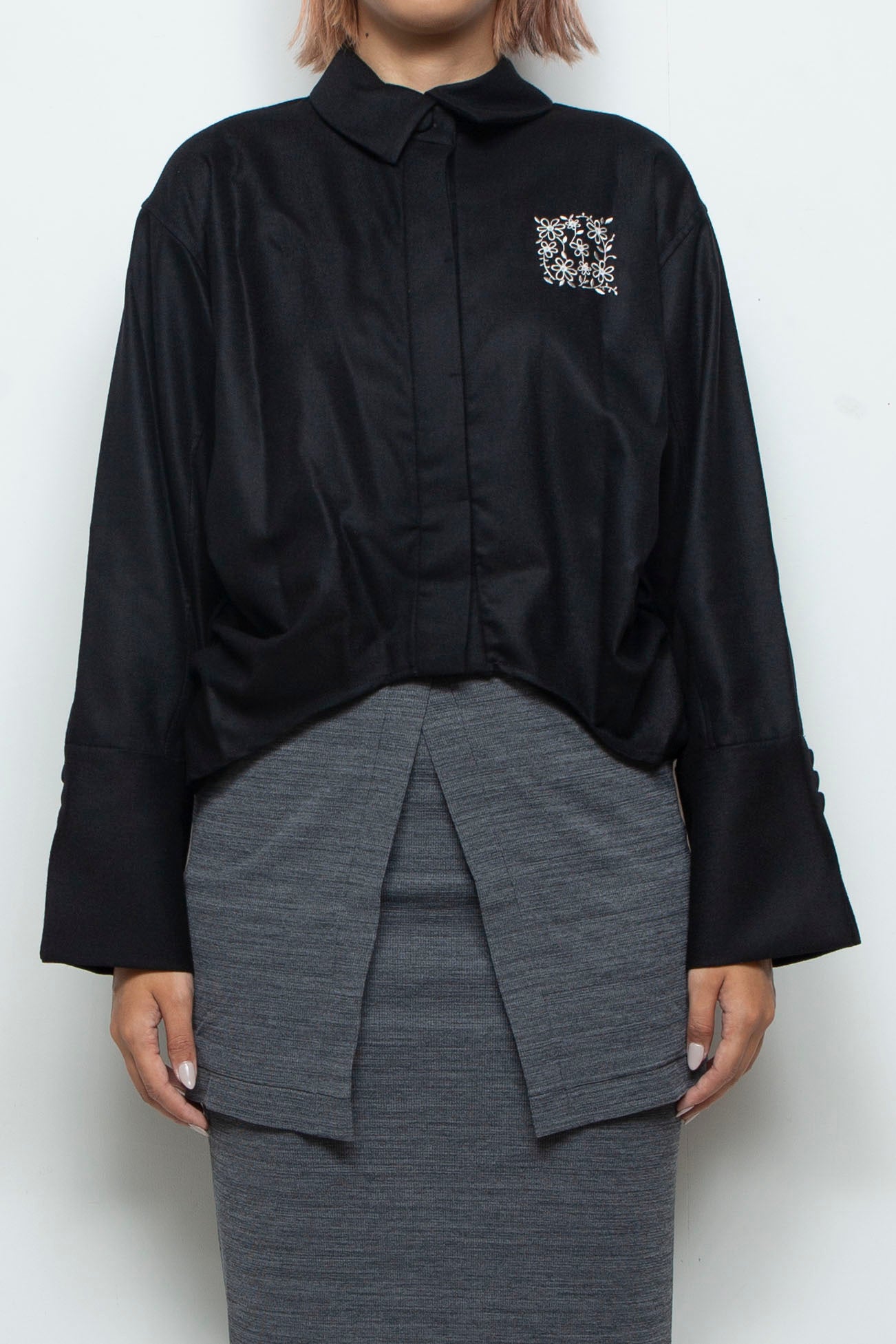 あたたかみのあるウール生地を使用したショートトップス。軽量でありつつも適度な肉感のある素材のため、シャツジャケットのようにご着用いただけます。胸元には小さなガーデンをイメージした刺繍入り。