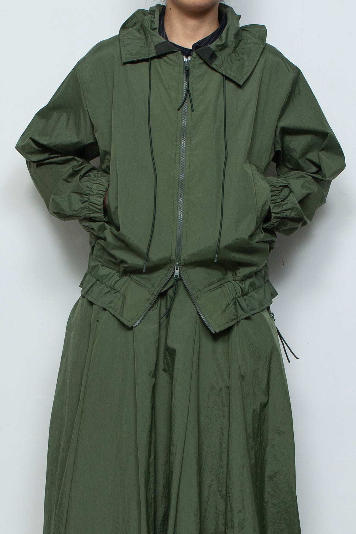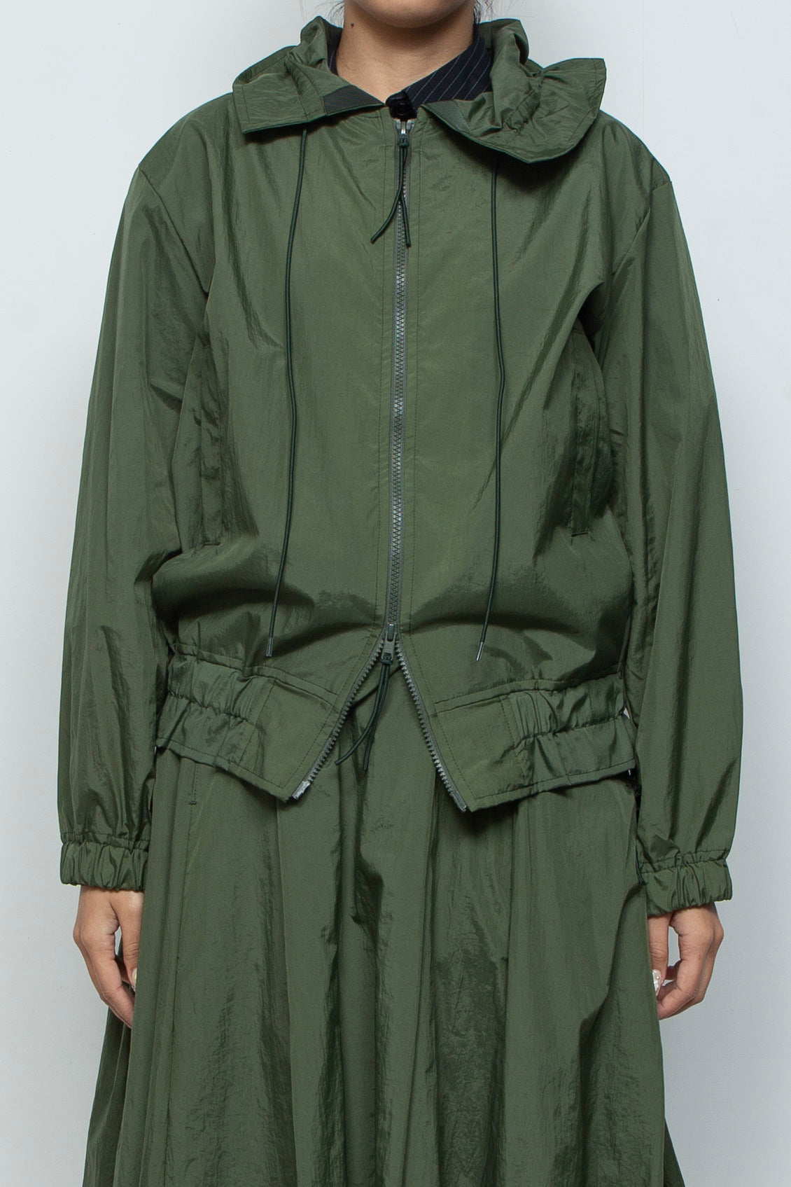 裾とフードのギャザーデザインが入ったライトブルゾン。