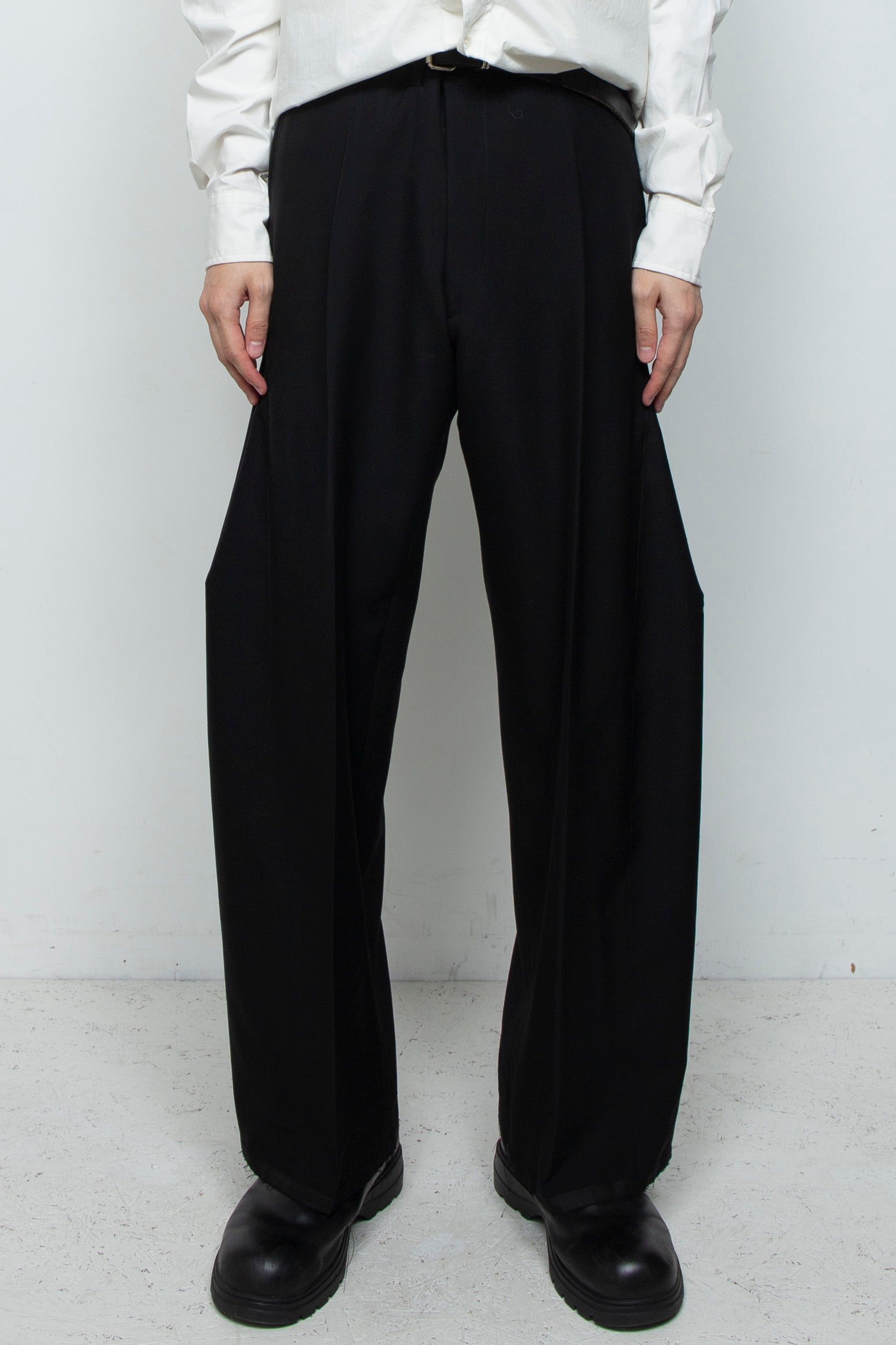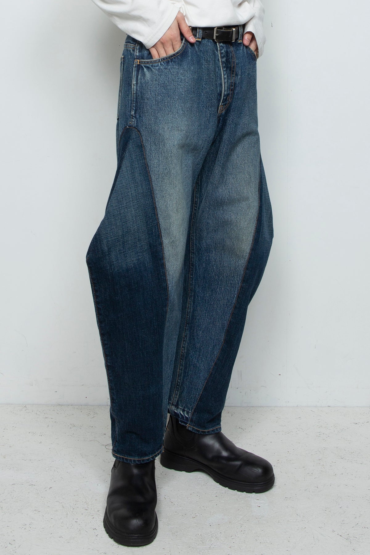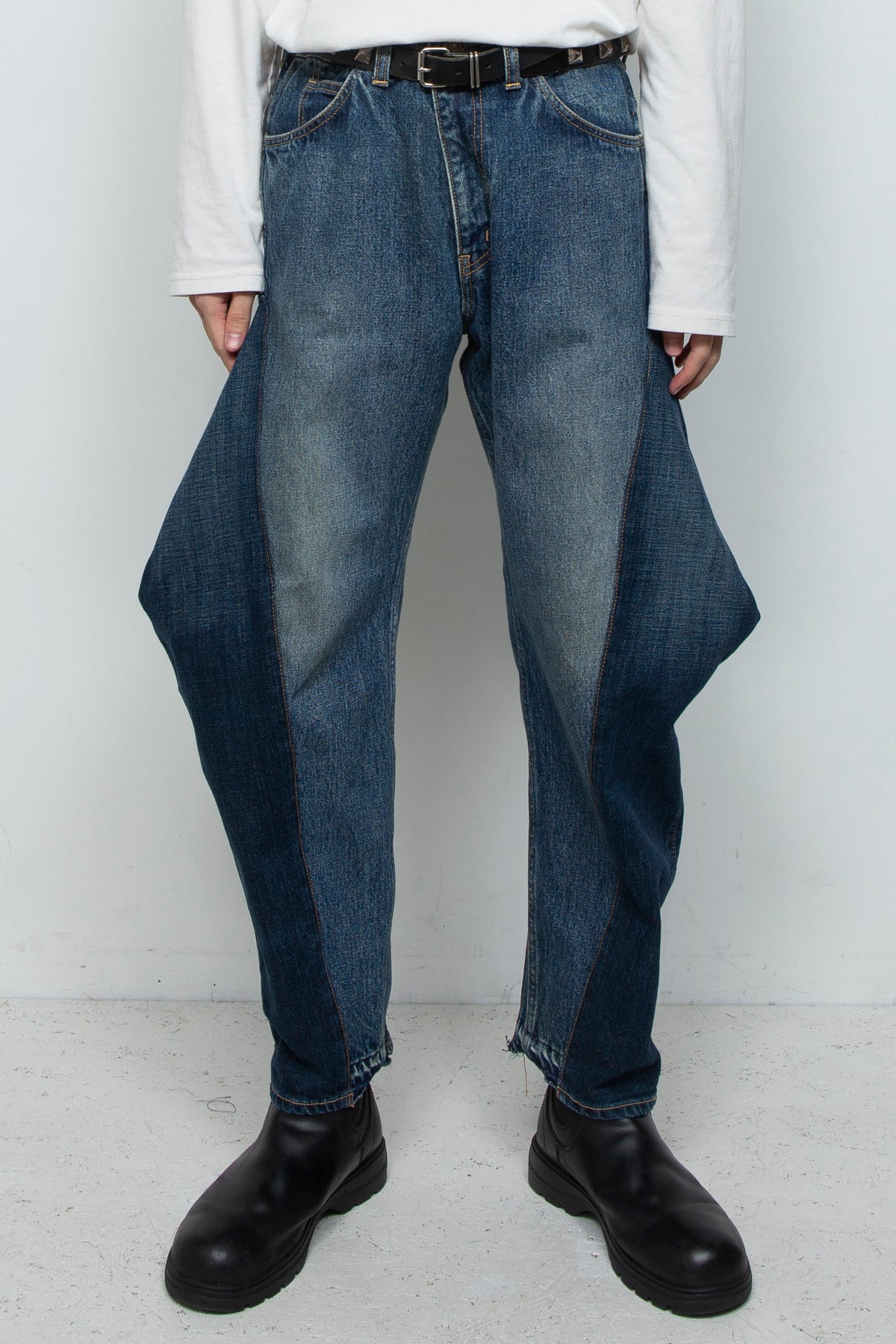 脇の部分に別のデニムパンツを差し込ませて、深いダーツを入れることで、独特なシルエットとなったパンツです。
