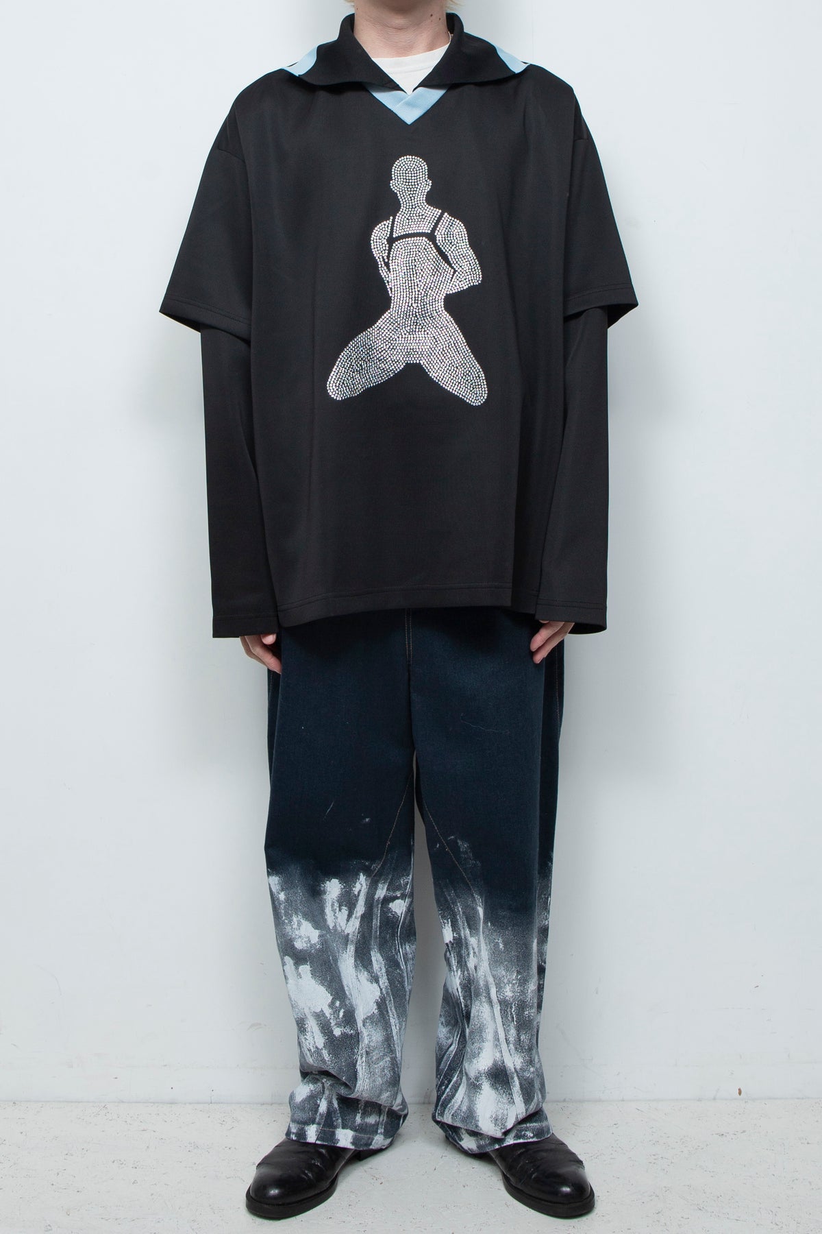 ラインストーンダブルレイヤーオーバーサイズジャージ。ユニークなダブルレイヤースリーブデザインで、オーバーサイズのフィット感が特徴です。