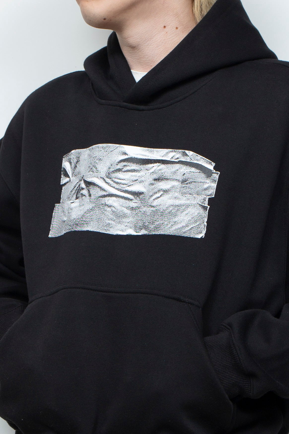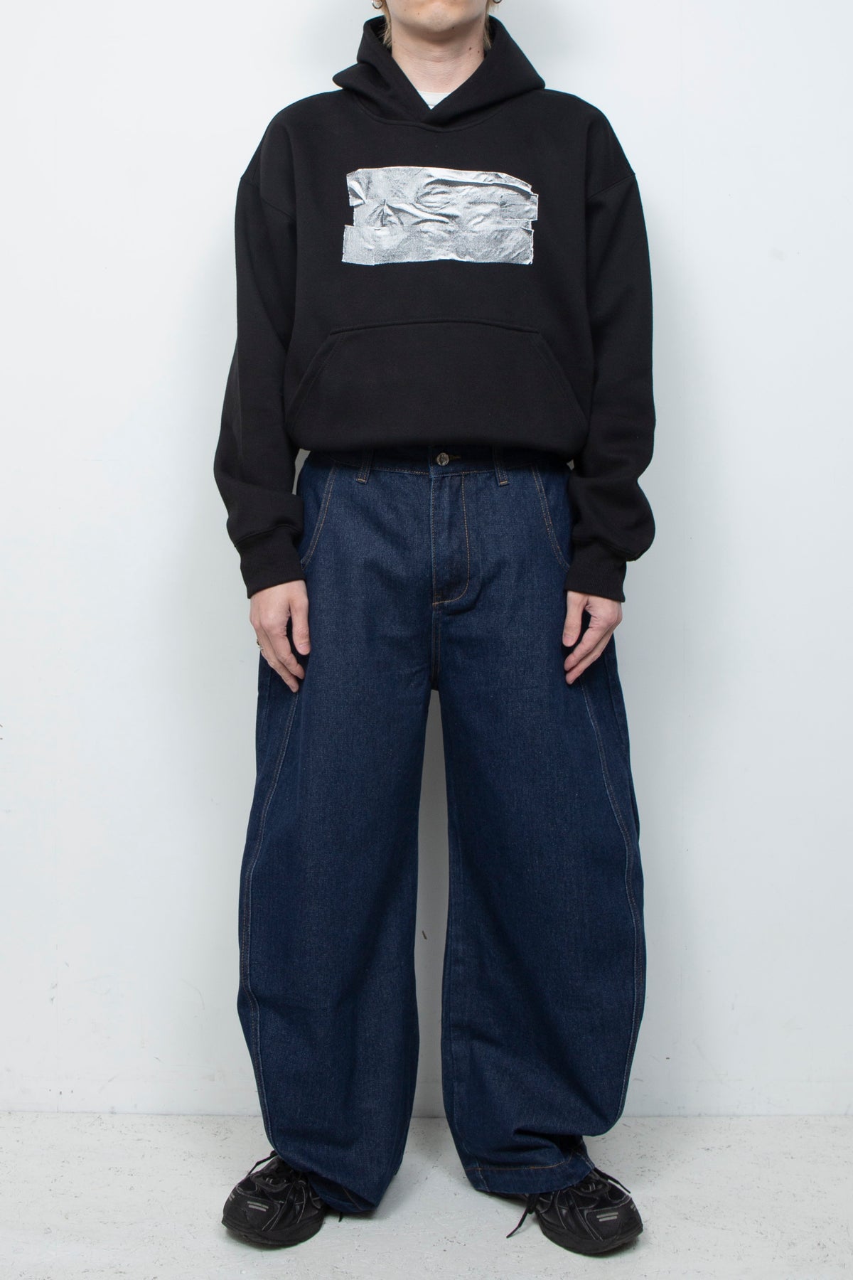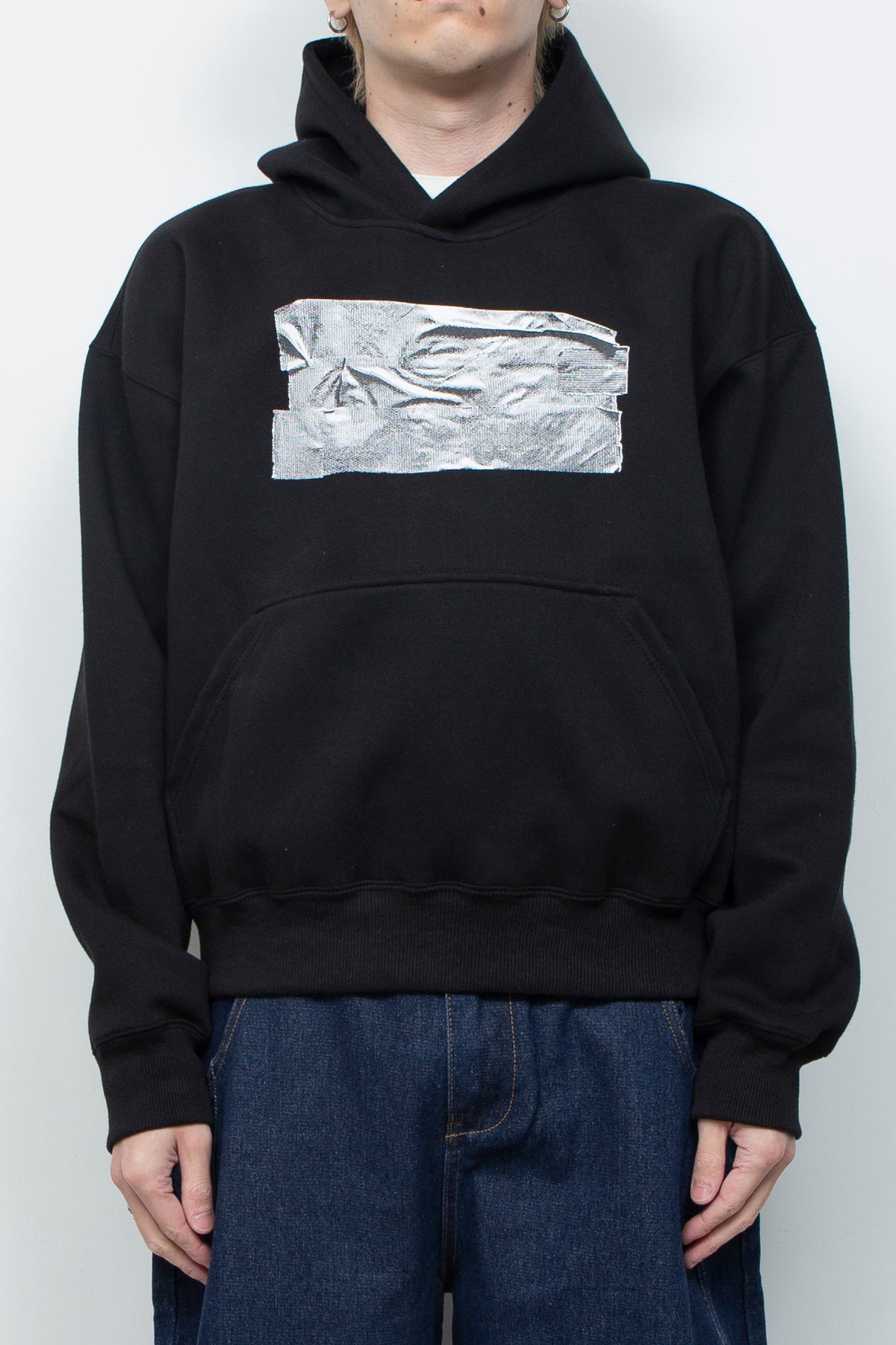 ボックスシルエットのヘビーウェイトフーディー。海外のコピー商品市場で警察が取り締まりを行う際、販売者がロゴをテープで隠す手法から着想を得ています。黒・グレー・白の3色でテープの質感を表現。