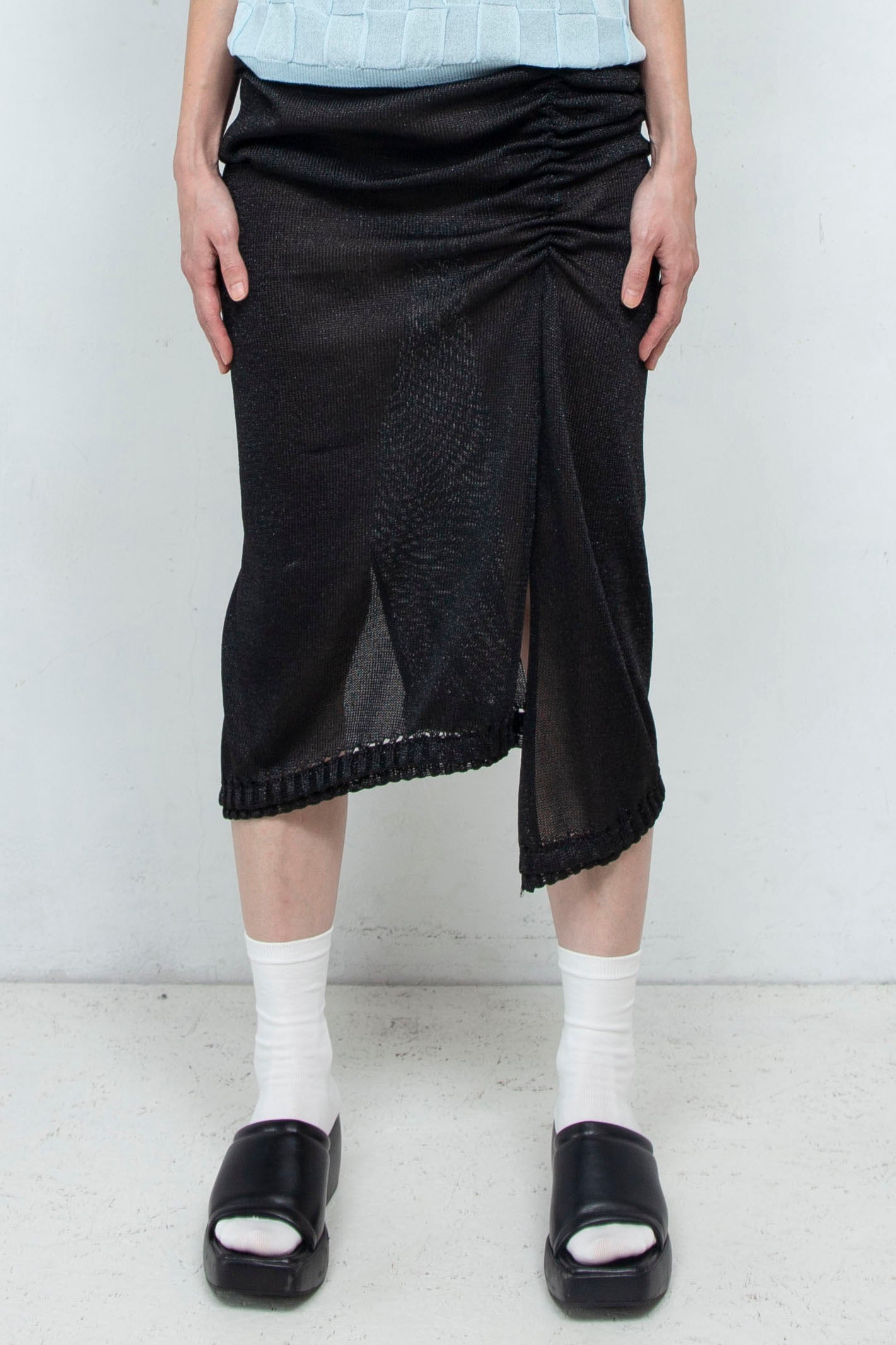たっぷりとしたギャザーを取り入れたニットスカート。スリット入りで、光沢感のある生地が高級感のあるデザイン。