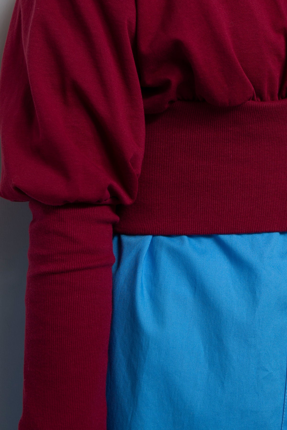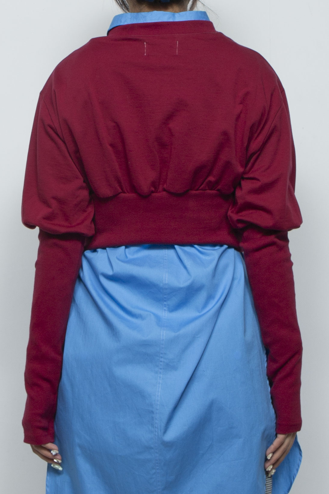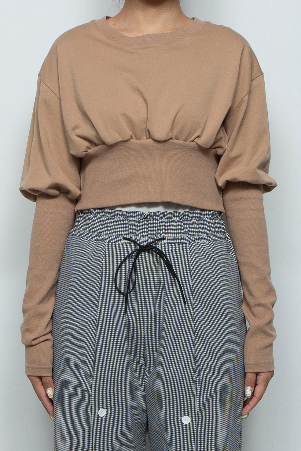 袖とウエストに大胆にリブを配したデザインののショートトップス。肘部分はクシュッとすることでよりフェミニンな印象に。