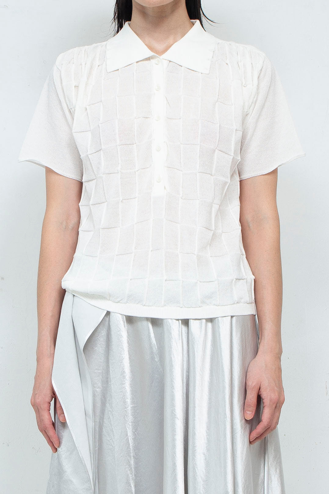 ローゲージなので夏にも涼しく着用でき、襟・裾の編み地の切り替えがアクセント。