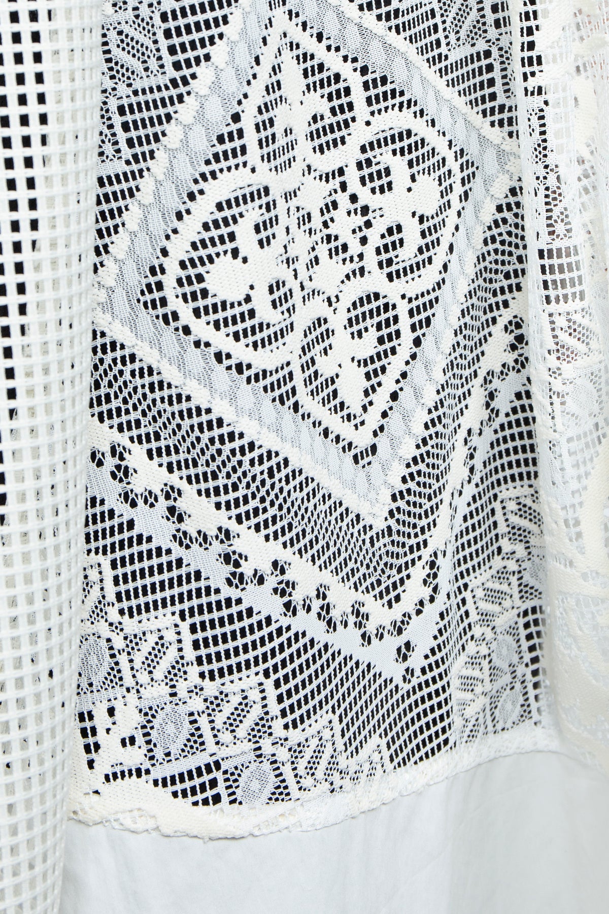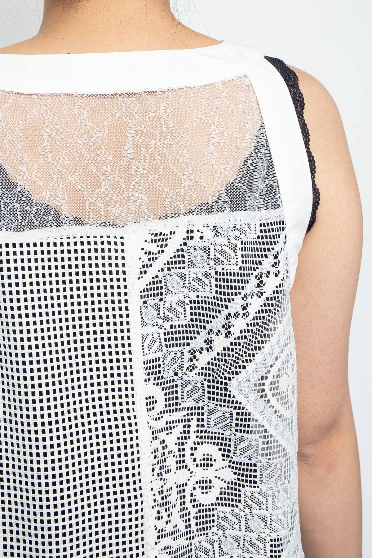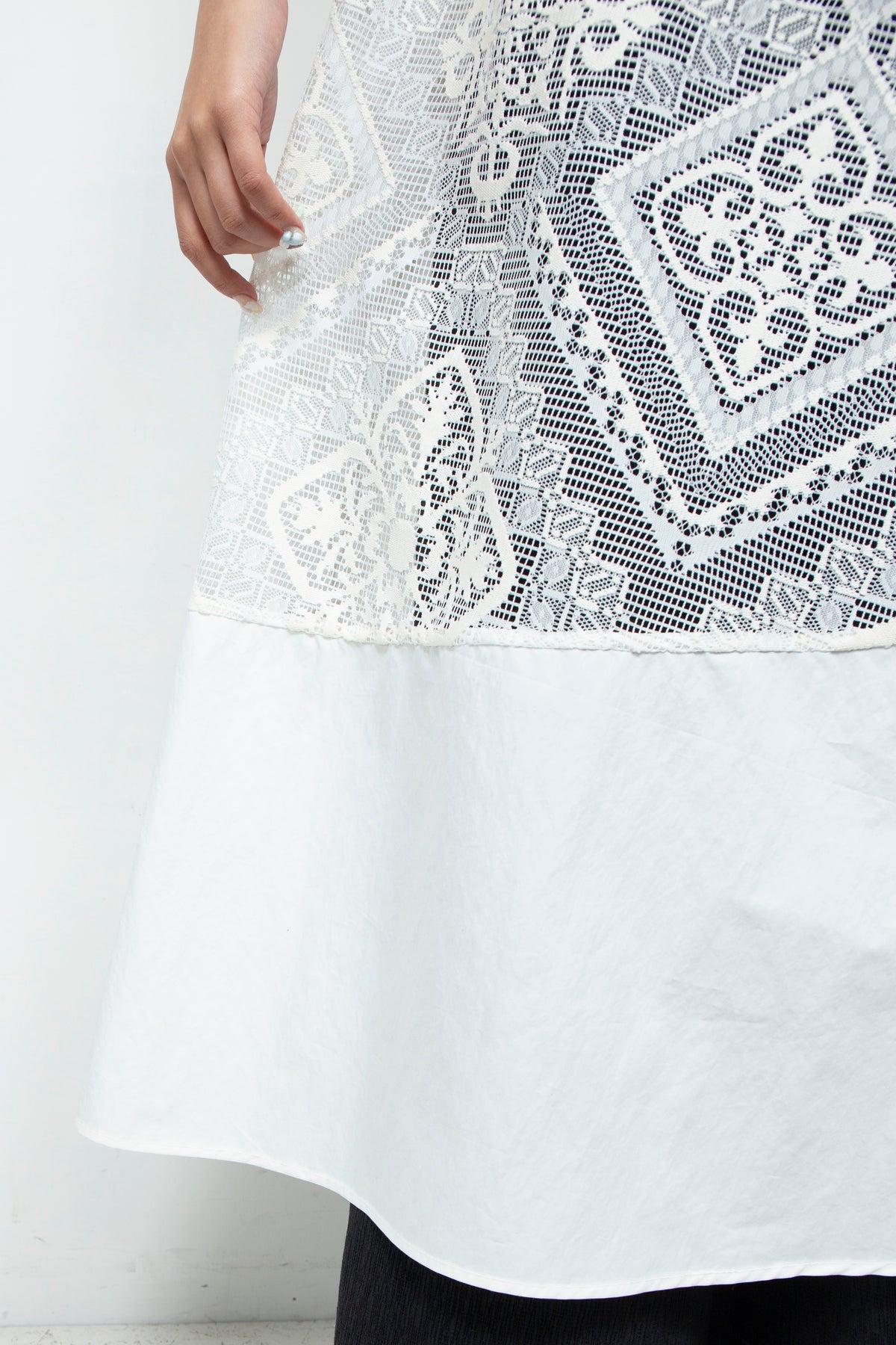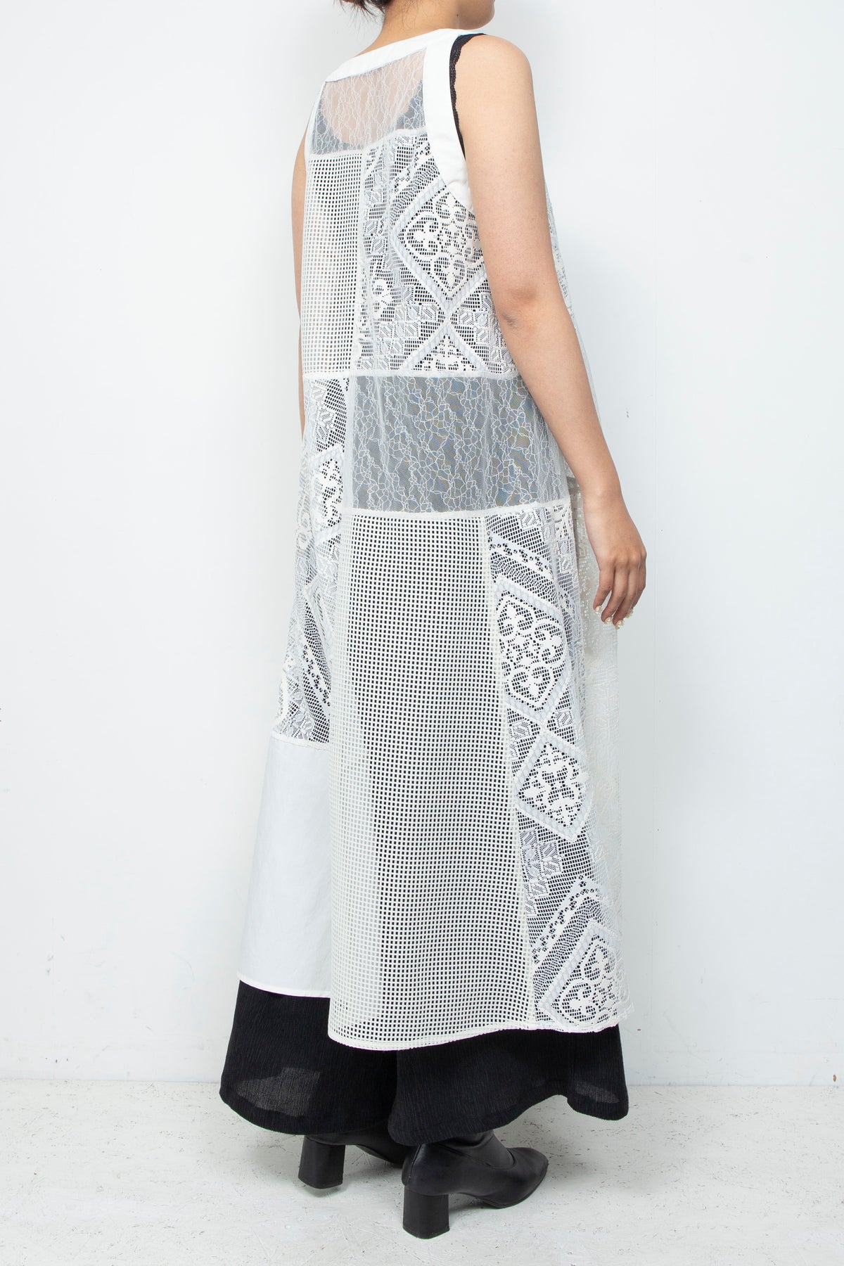 繊細なレースと異素材を組み合わせたパッチワークドレス。光を透かすレースと布帛の対比が印象的で、Tシャツやデニムに重ねてカジュアルに、スカートやワイドパンツと合わせて女性らしく着こなせます。インナーにブラックなどの差し色を入れると、コントラストが際立ち雰囲気を変えて楽しめる一着です。