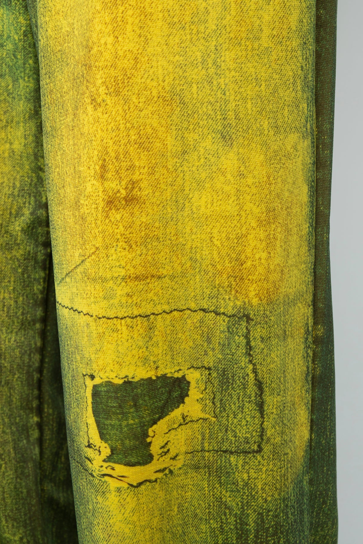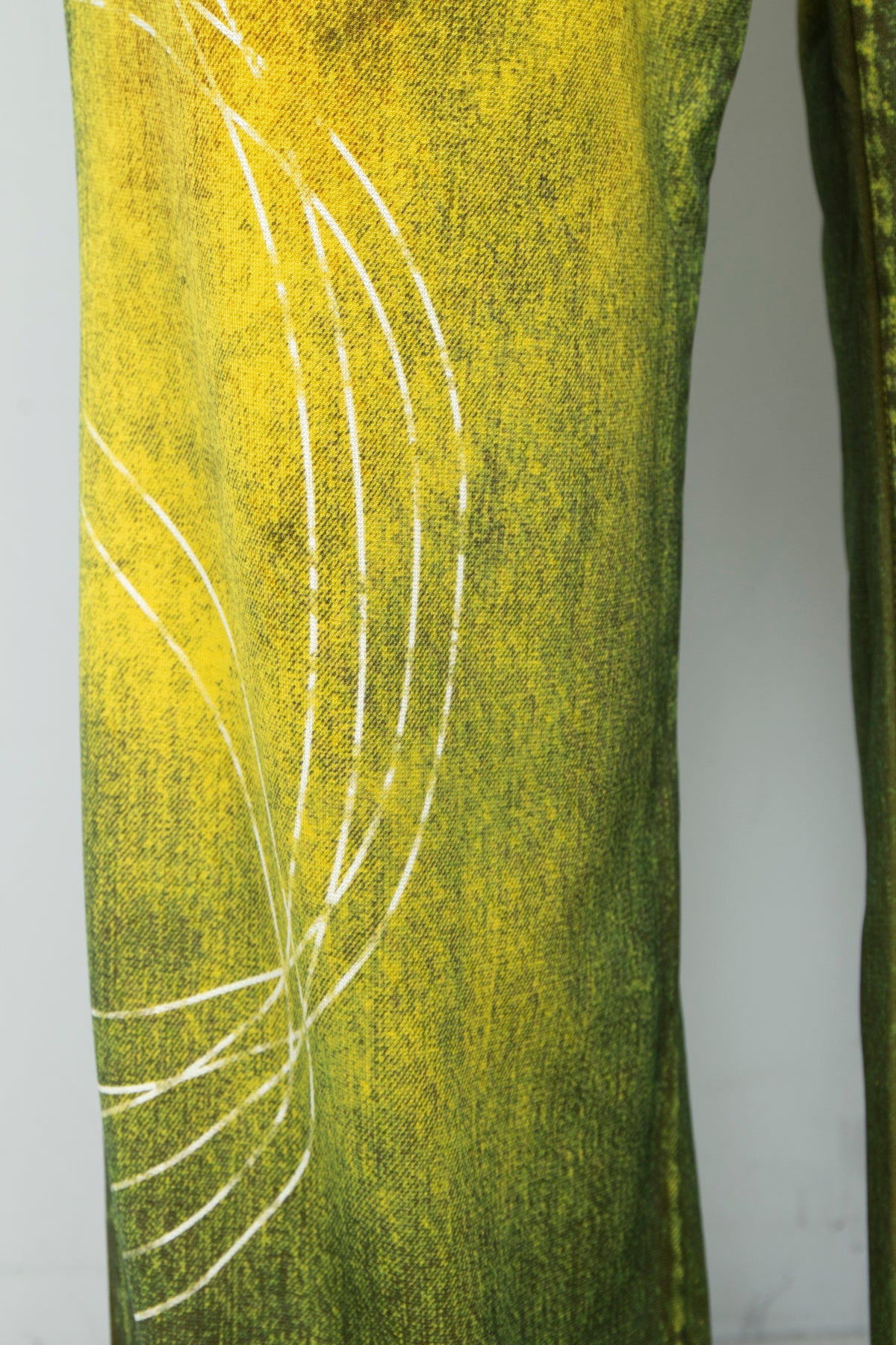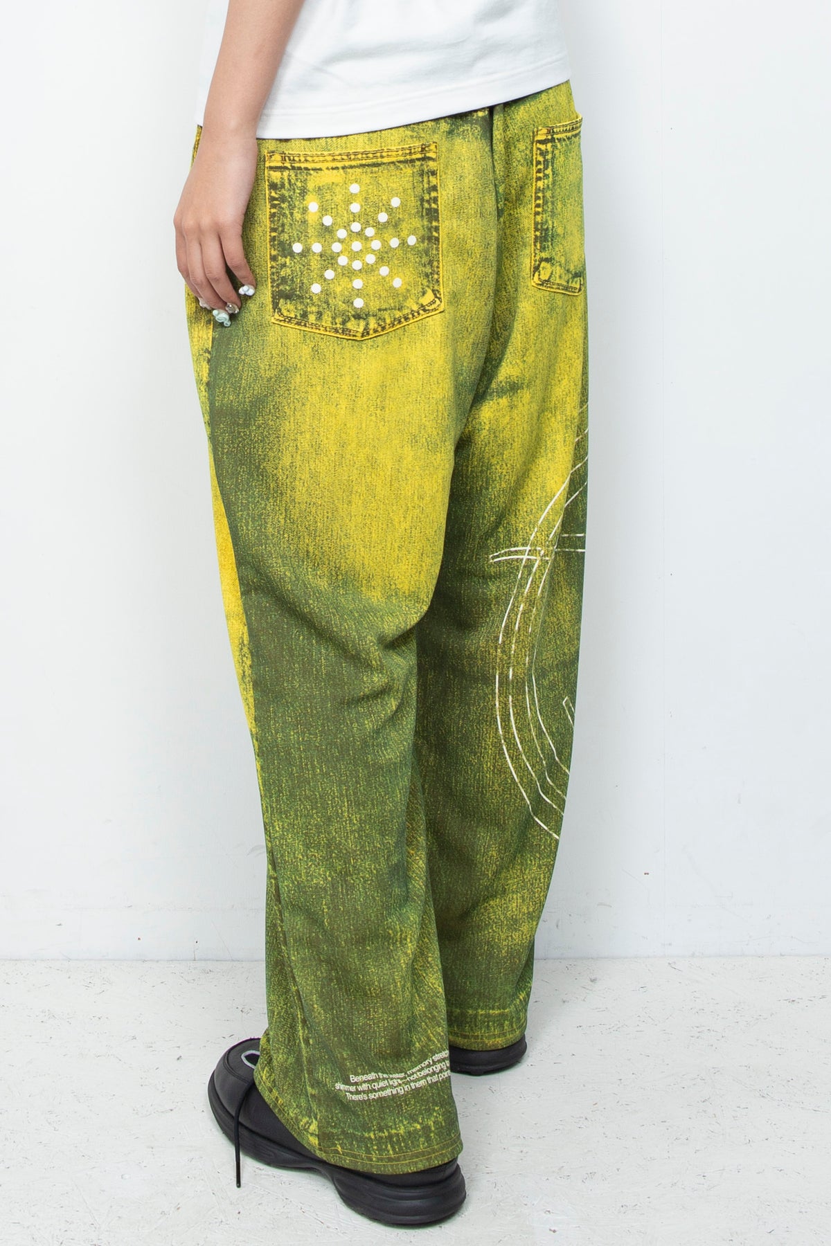 デニムの画像データをカラーパンツにプリント。縫い目のあたり部分など細かい部分まで型紙に合わせてデータを作りこんでいます。3Dプリントで海をイメージしたグラフィックをレイヤード。
