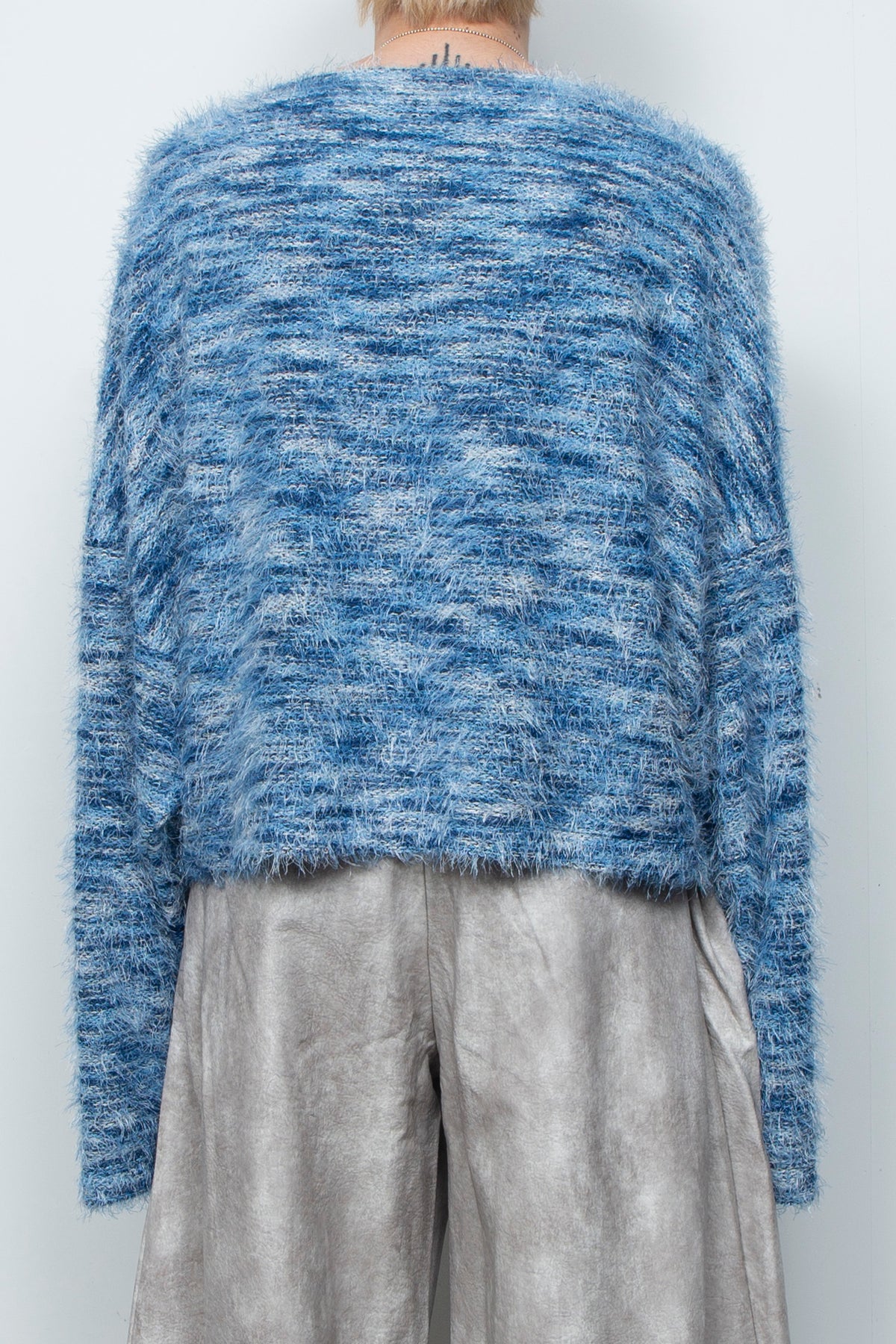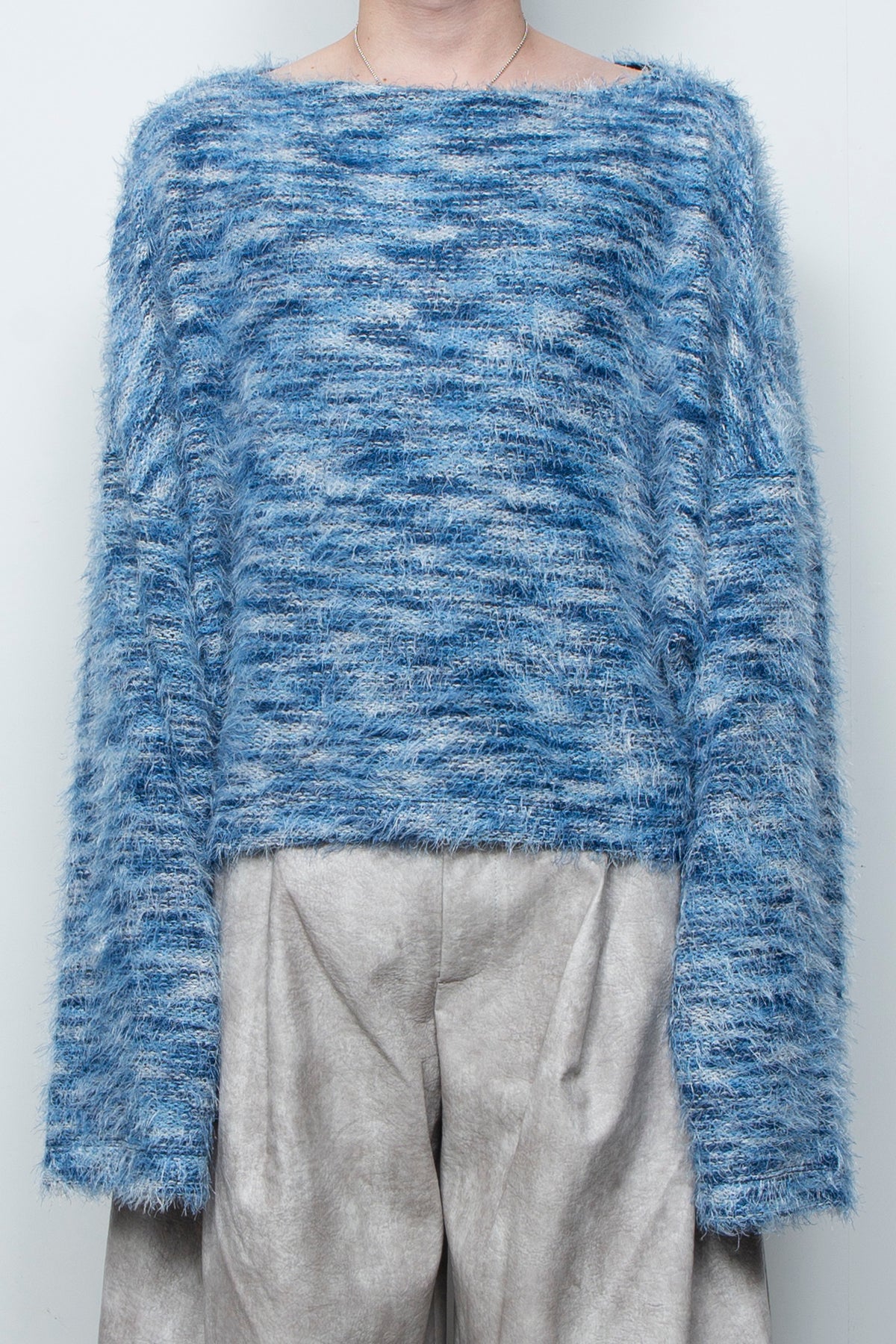 オーバーサイズのプルオーバーニット。グラデーションカラーの毛足の長い糸が特徴で、ローゲージのため重ね着もしやすい仕様です。