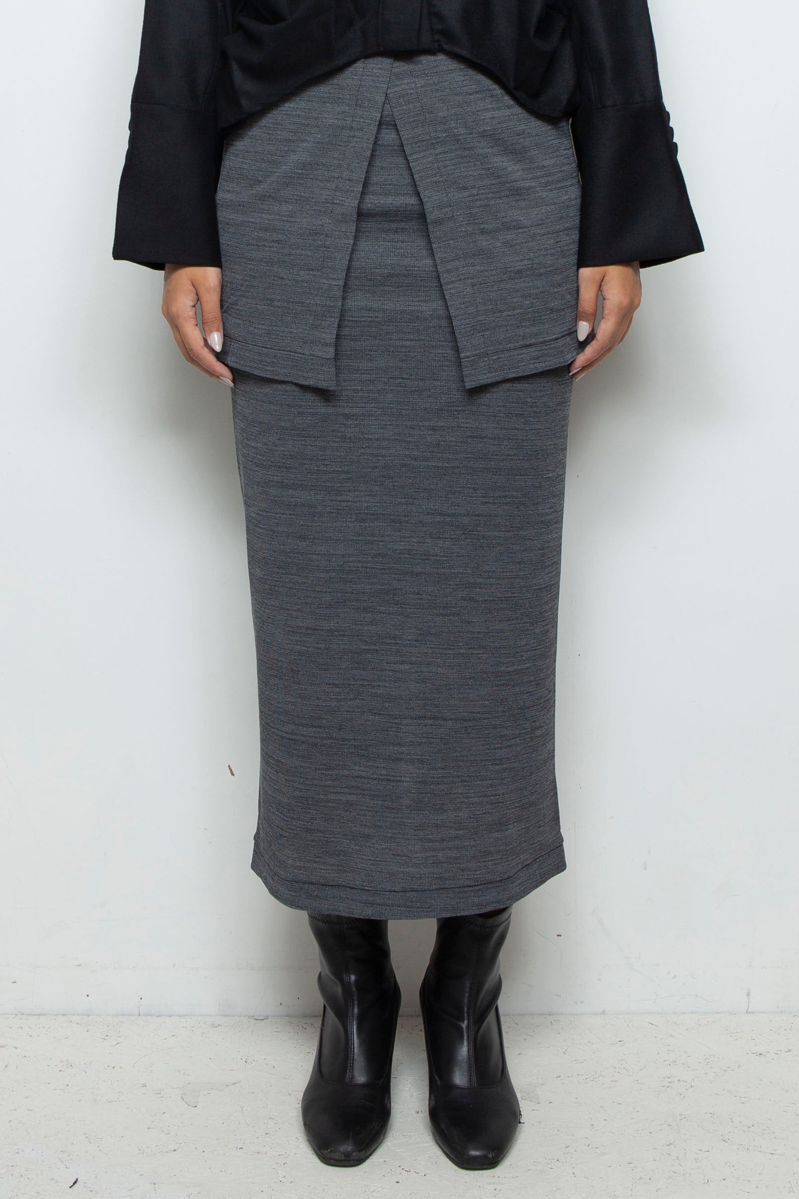 サラッとしたワッフルカットソーを使用したスカートです。腰回りのレイヤー布はフレームのように周囲が縁取られたデザインです。ウエストはゴムのためゆったりとご着用いただけます。