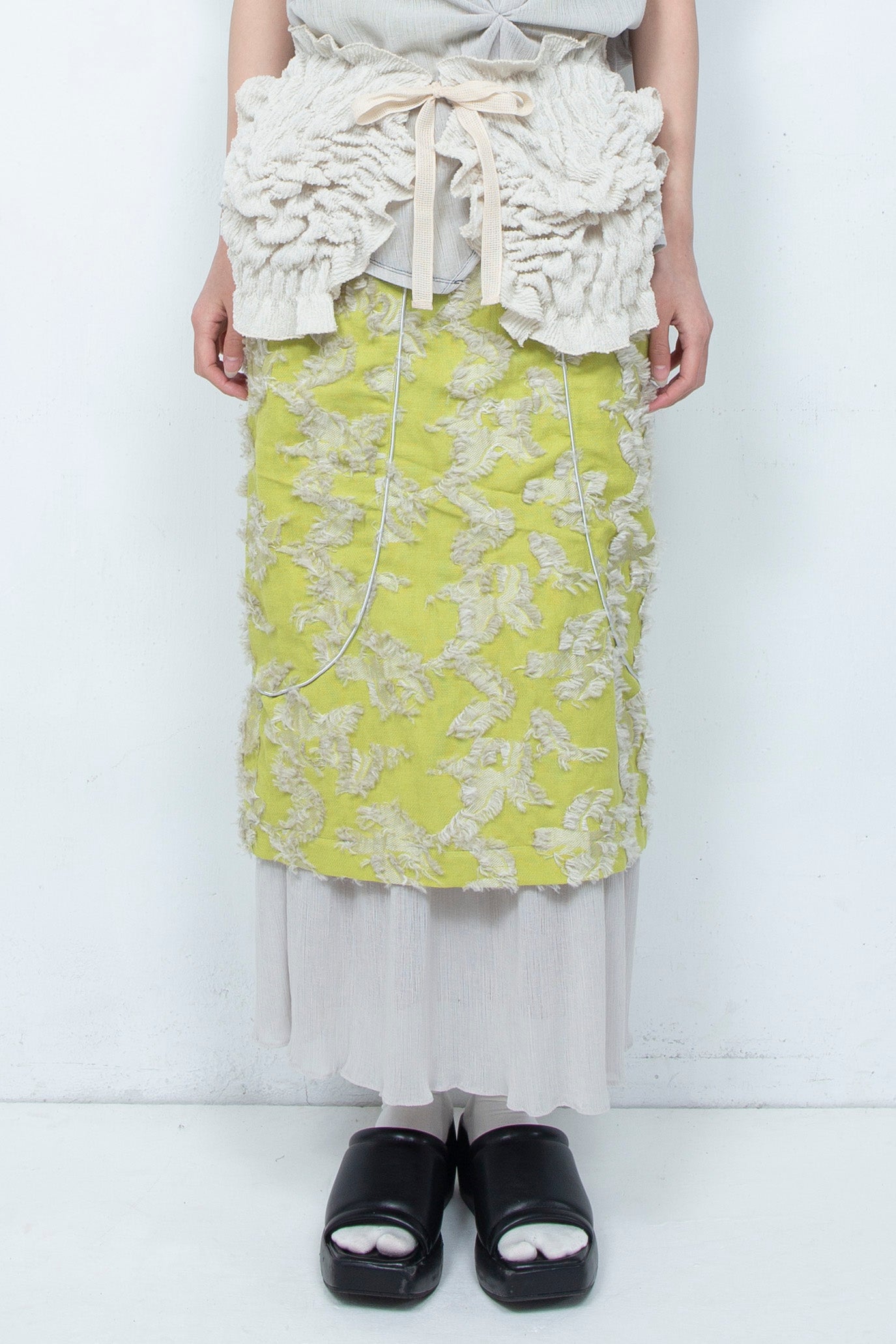 サラッとしたワッフルカットソーを使用したスカートです。腰回りのレイヤー布はフレームのように周囲が縁取られたデザインです。ウエストはゴムのためゆったりとご着用いただけます。