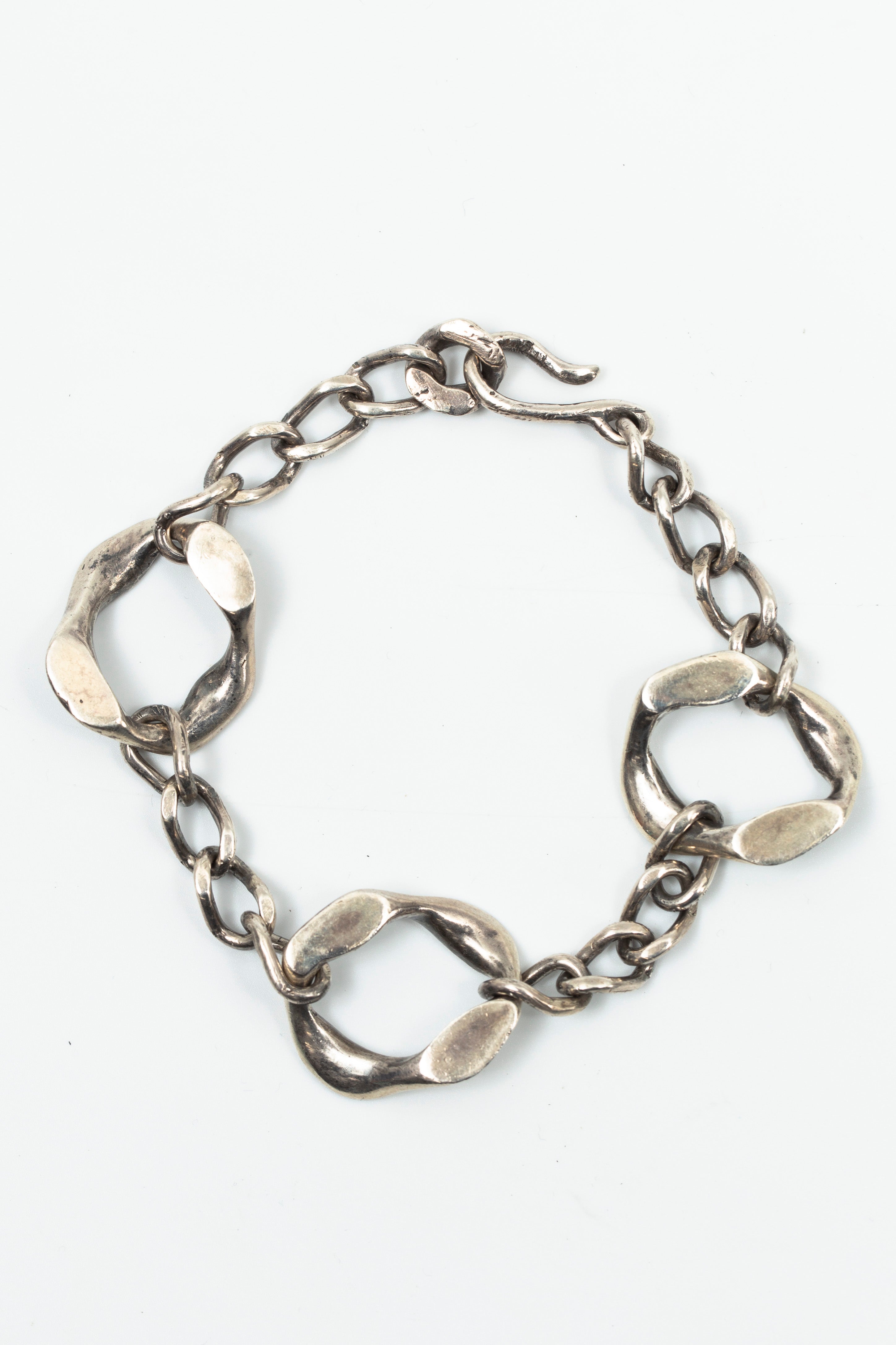 大小から成るチェーンのグラデーションが蛇のように見えた事から、自らの尾を噛み永遠性を表すウロボロスをモチーフとしました。職人の手仕事が味わい深いブレスレットです。