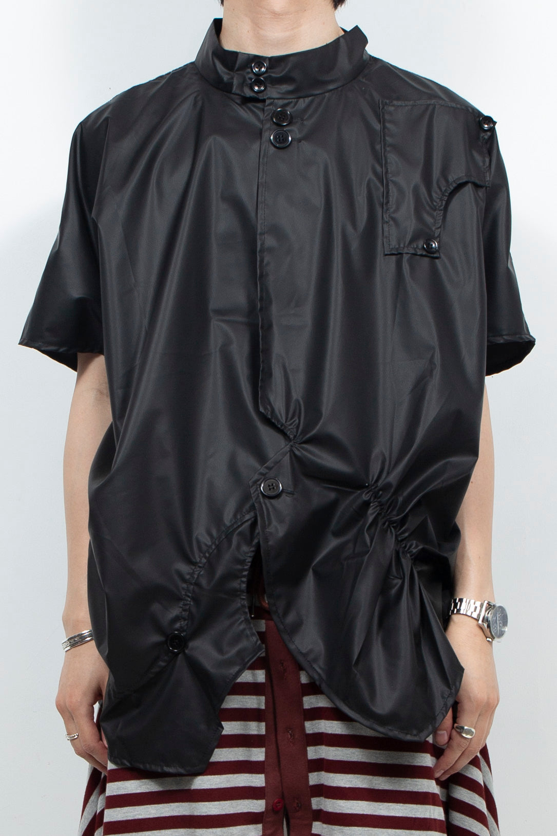 胸元のクロスストラップ特徴のTシャツ。ドレープによるドレッシーな雰囲気がユニセックスでおすすめで、通気性に優れた生地を使用。