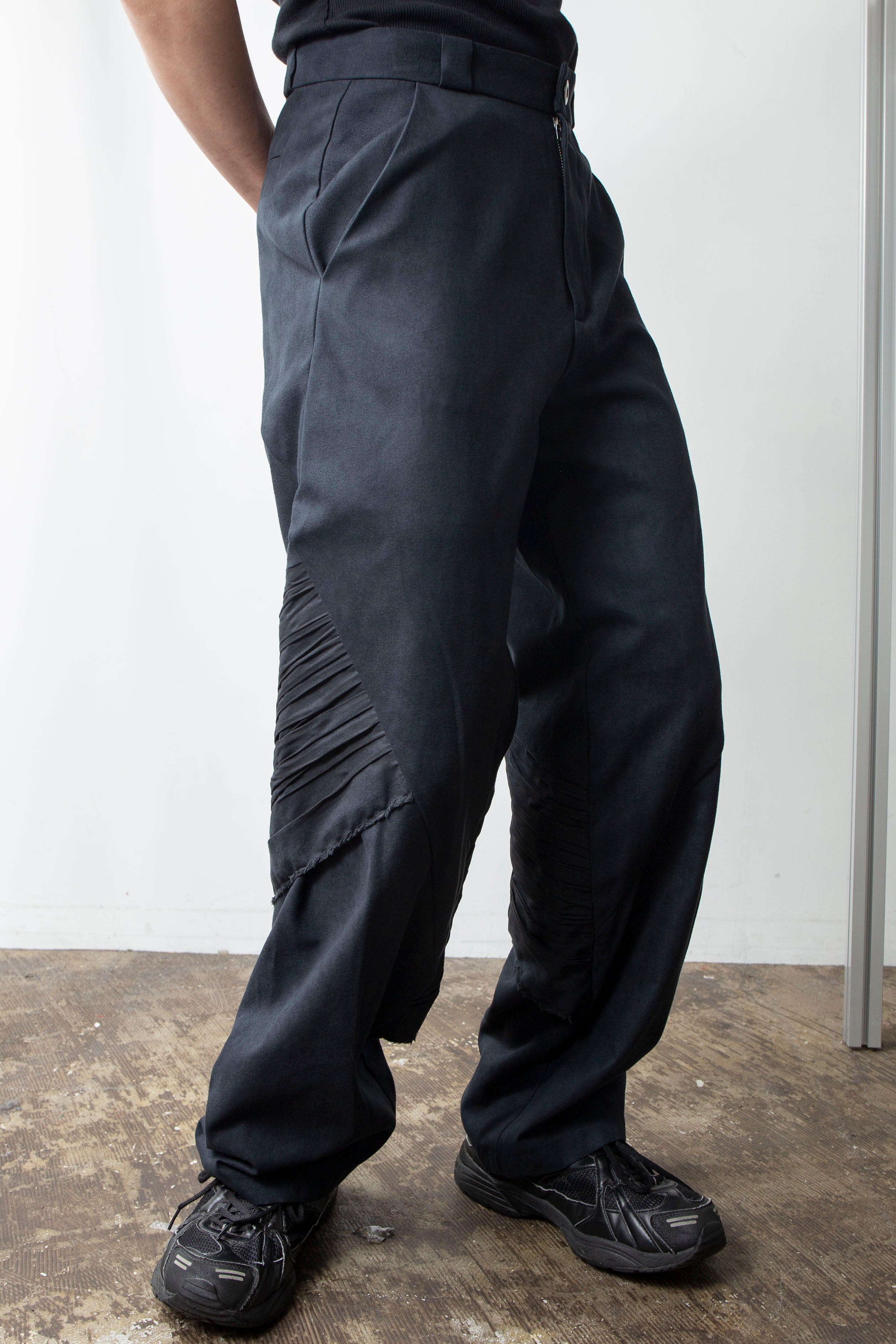 膝から脹脛にかけて配置されたパーツはツイスト状の加工が施されており、その工程は手作業によって 皺の操作が行われています。