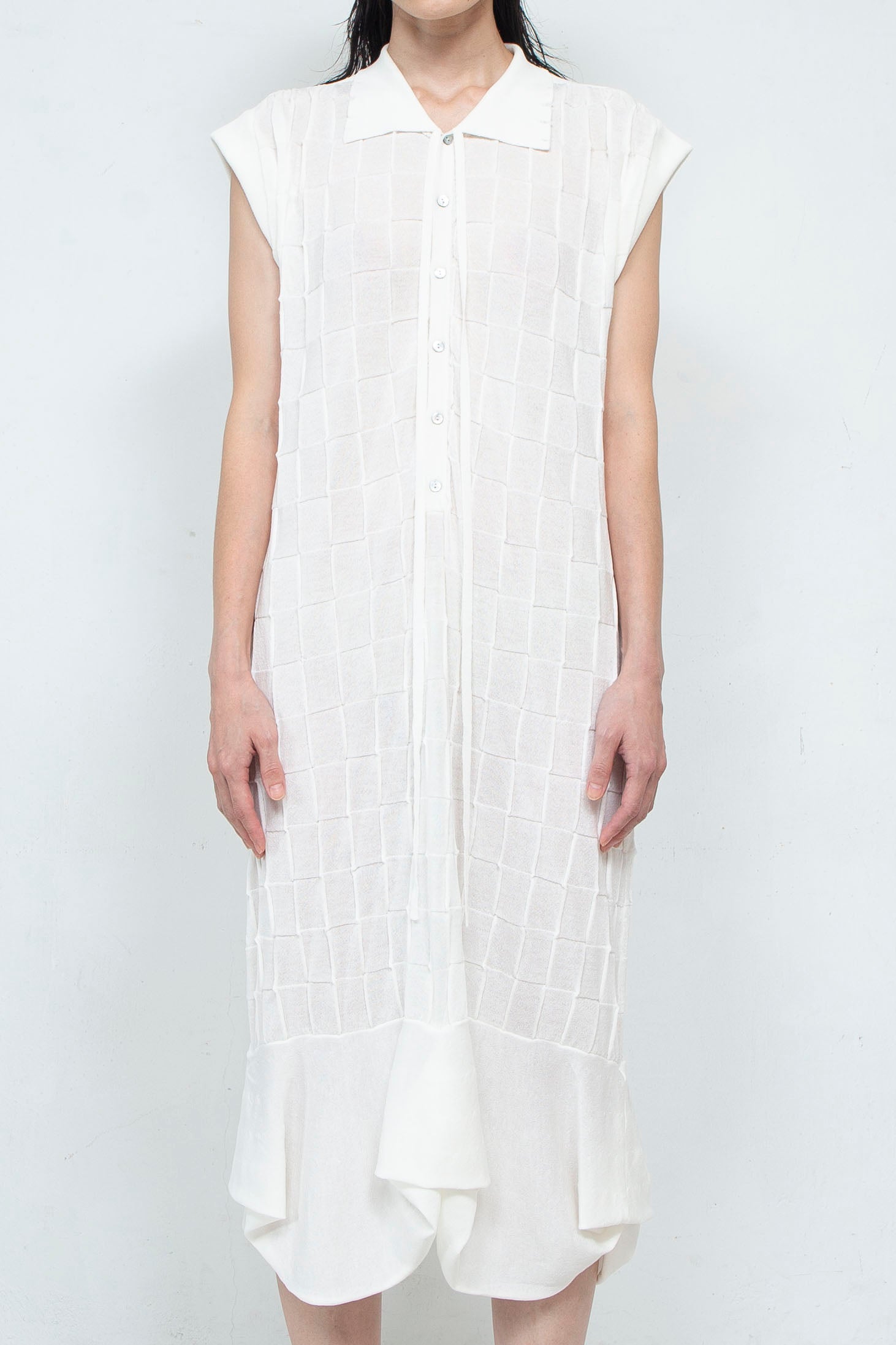 凹凸感のある素材が特徴のポロワンピース。立体感のある格子柄の編み地が他にない雰囲気で、裾のフリルがフェミニンな印象に。