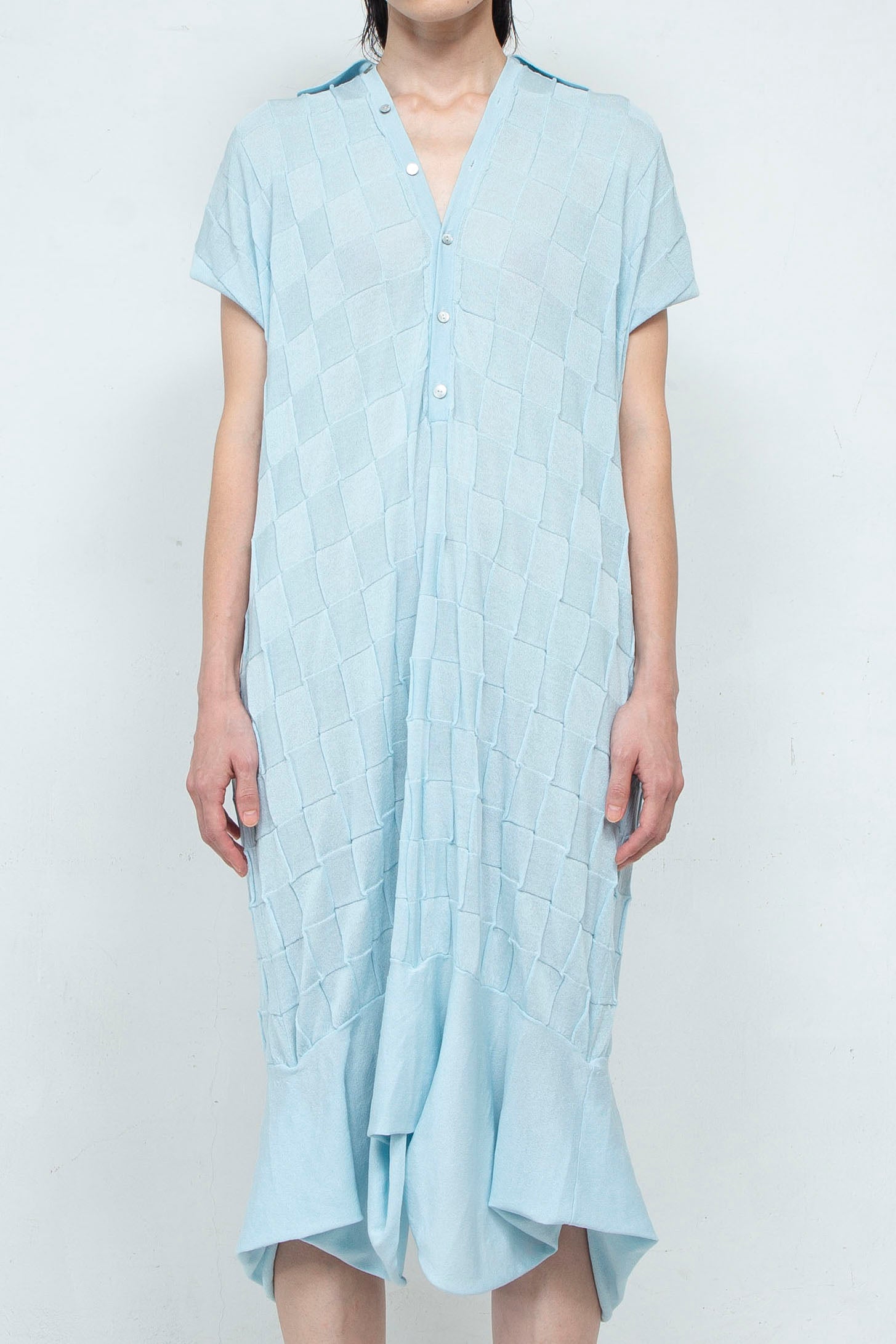 凹凸感のある素材が特徴のポロワンピース。立体感のある格子柄の編み地が他にない雰囲気で、裾のフリルがフェミニンな印象に。