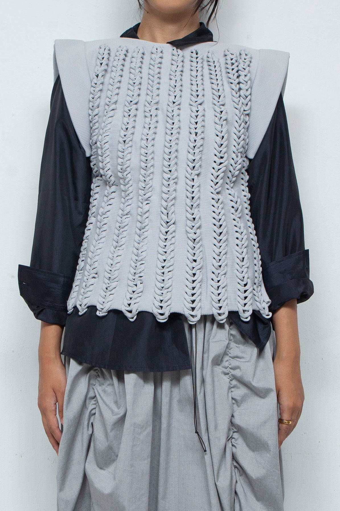凹凸のあるケーブルニットのデザインのタンクトップ。