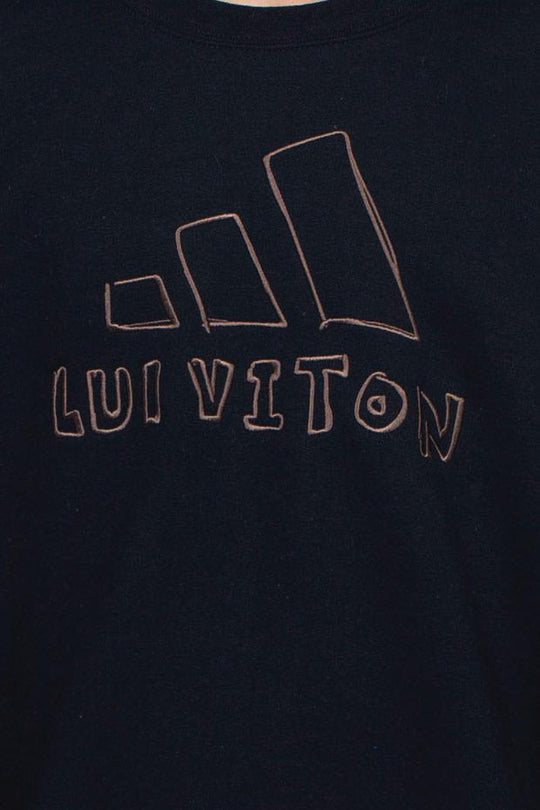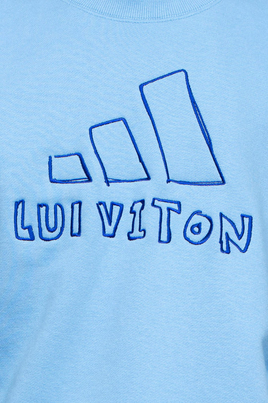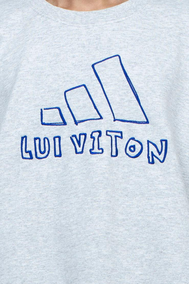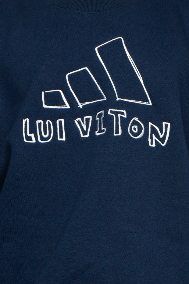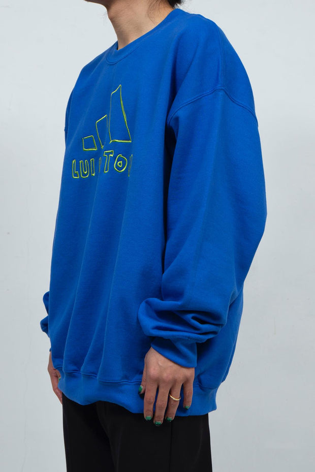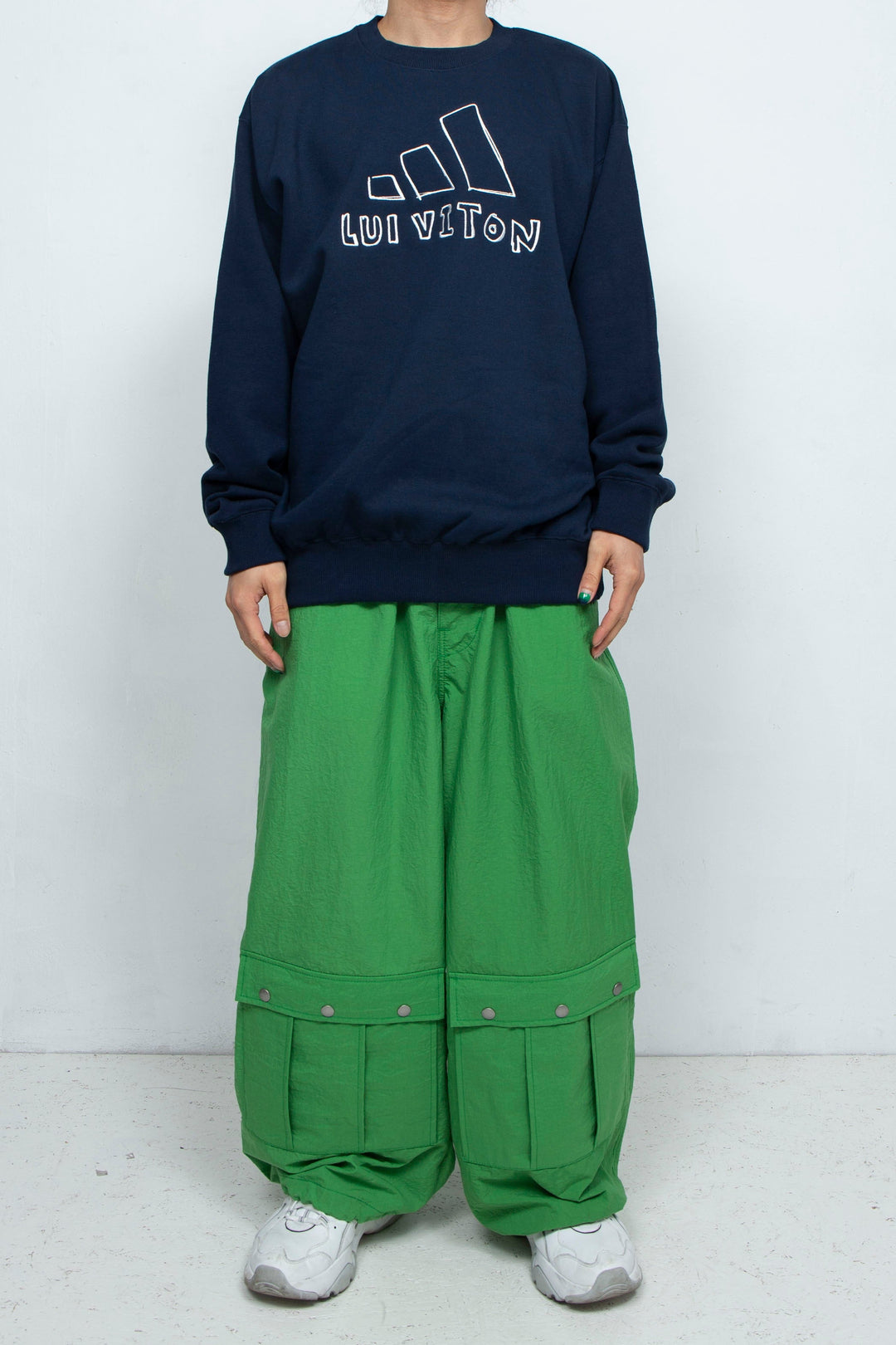 カタカナ発音のスペル間違いロゴと、スポーツメーカー風マークが落書きされたような刺繍のスウェット。