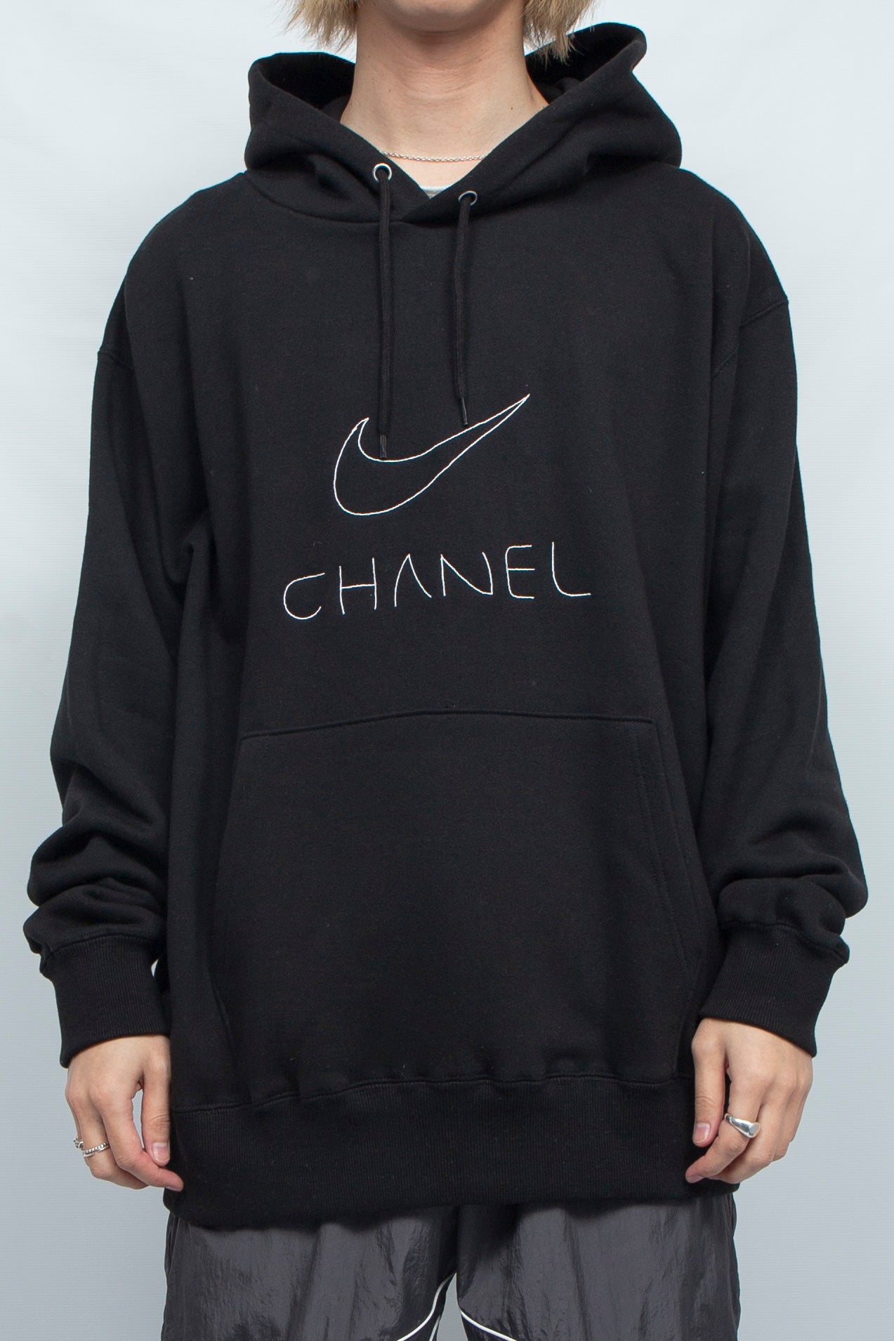 有名ファッションブランド風のロゴが刺繍されたパーカー。