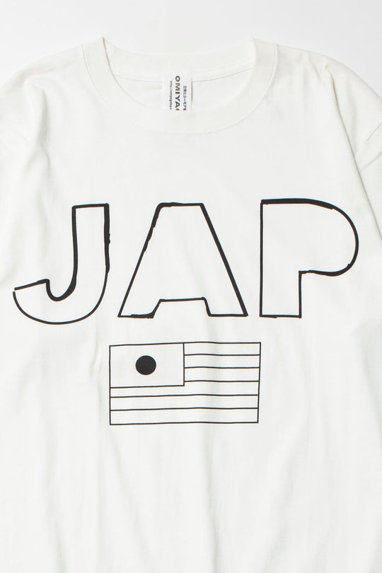 未完成のロゴとブラックユーモア的なデザインのTシャツです。
