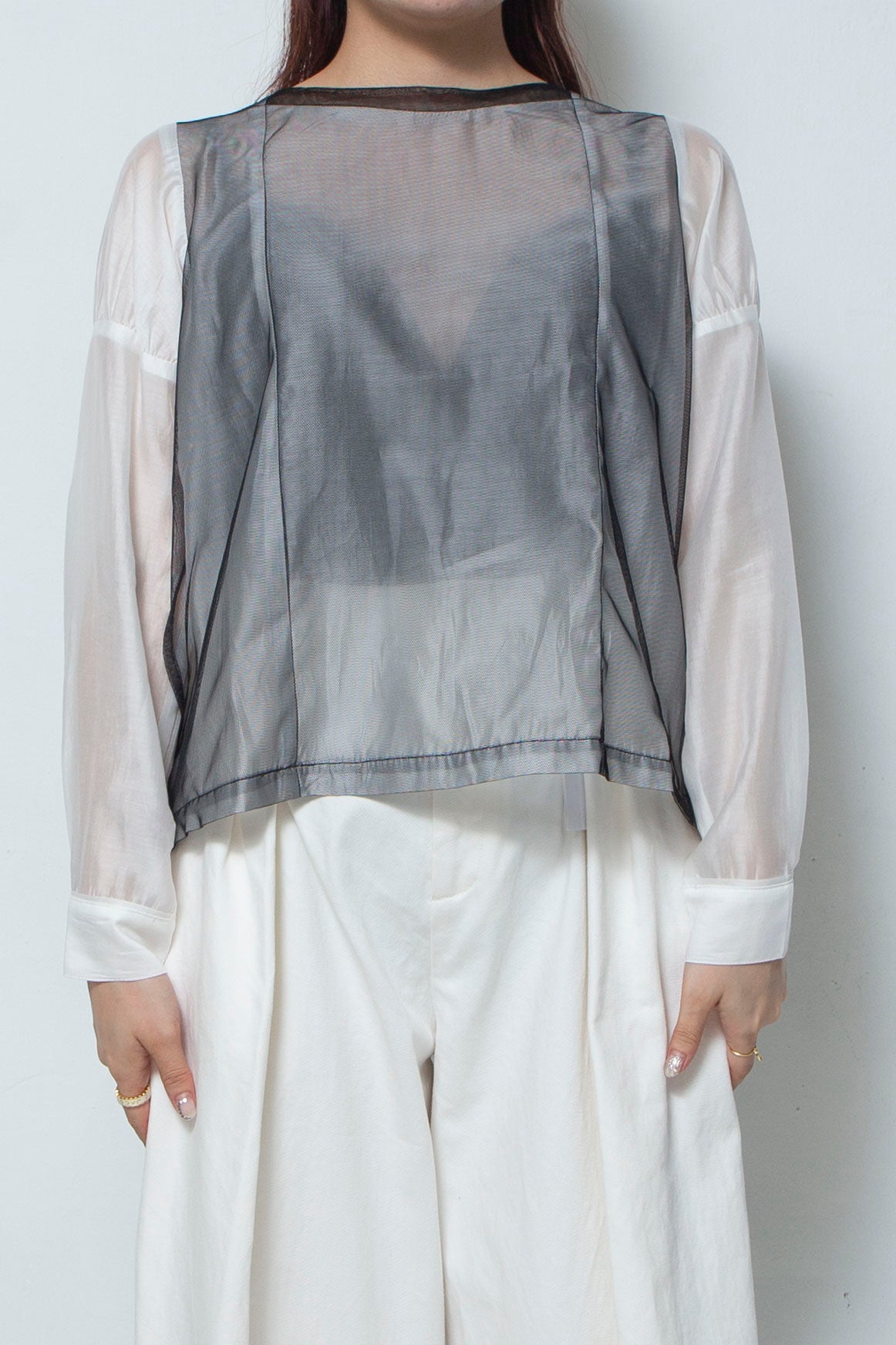 前見頃のフレアがポイントのTシャツ。左見頃の襟元からTシャツの上に一枚生地を加えることでフレアを表現。とろみのある生地感で、しなやかなドレープが生まれます。