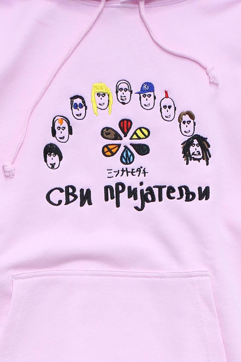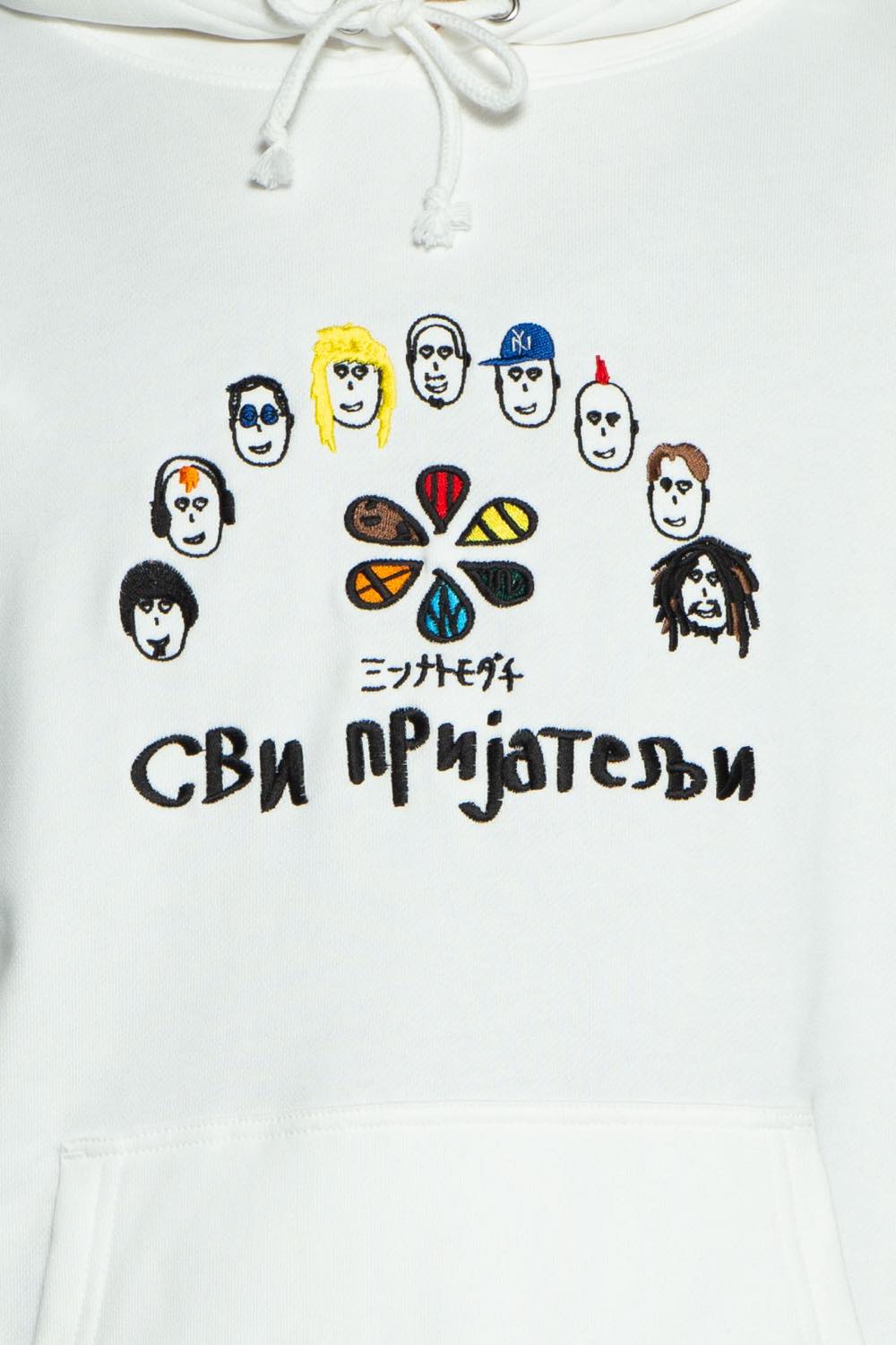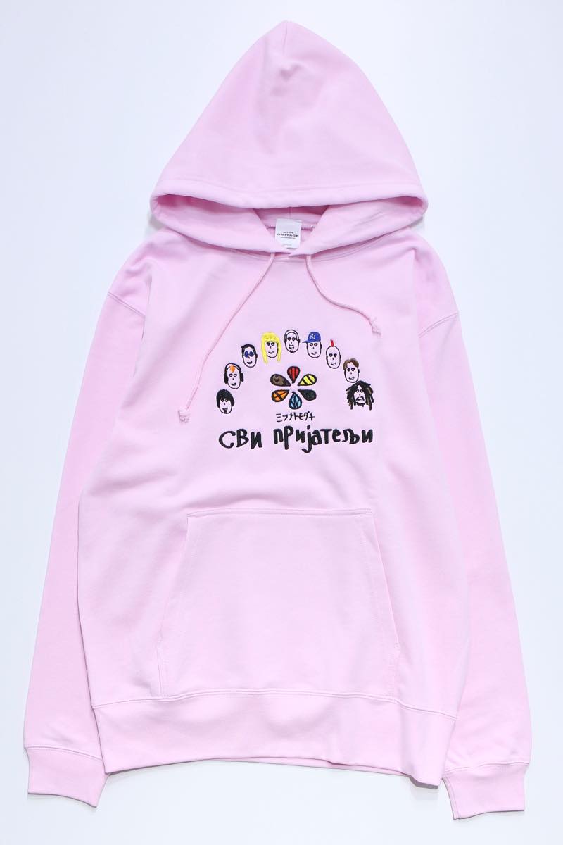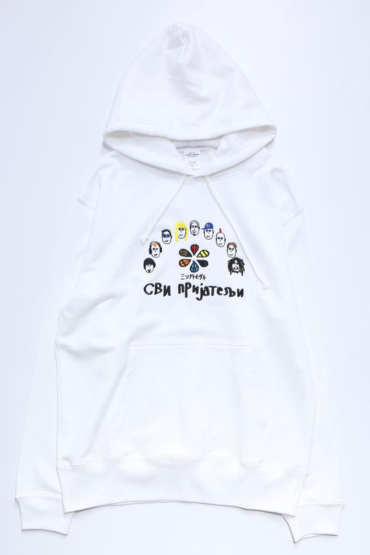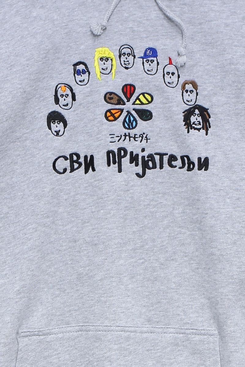 落書き風で多種多様な人の顔が刺繍されたパーカー。人種、ジャンルを越えて「ミンナトモダチ」。