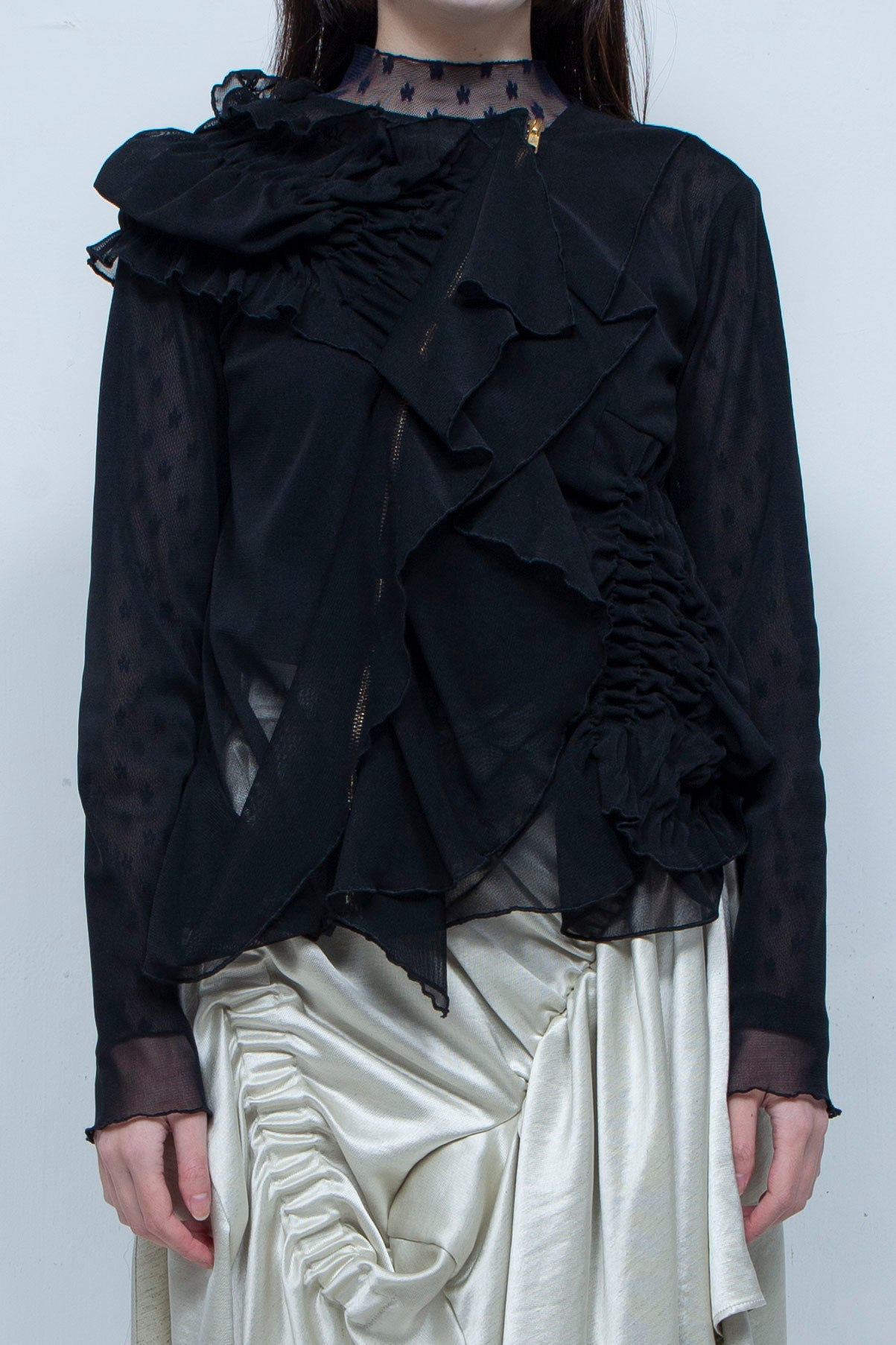 大理石のようなプリントと、無地のネットチュールを2枚重ねたシースルートップス。