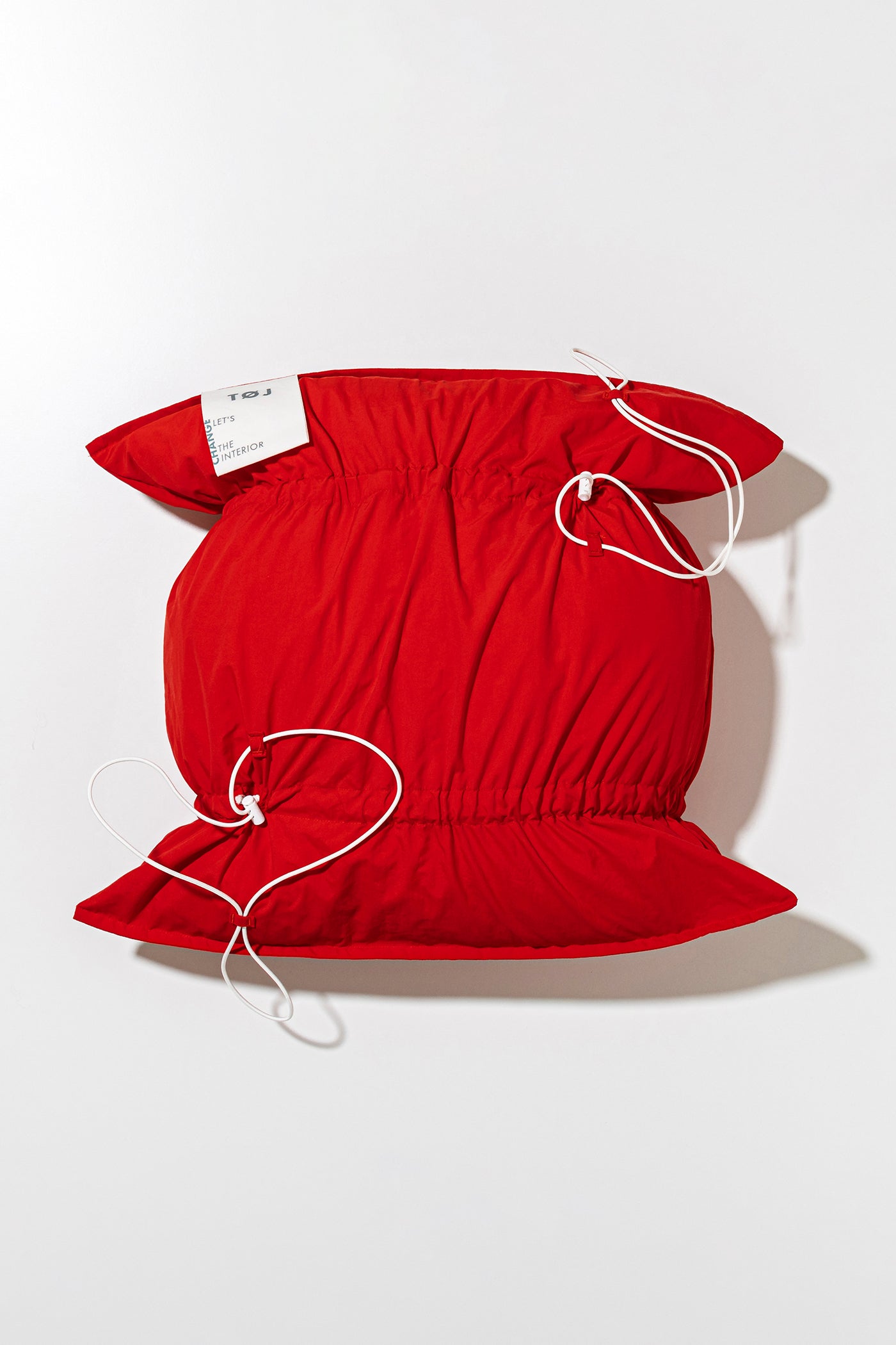 コードとストッパーがついており、絞ることで正方形のクッションが変形。