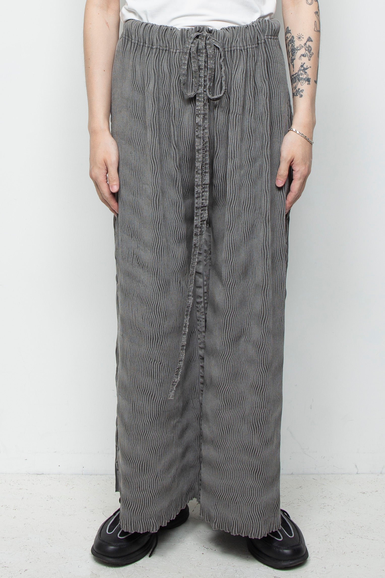 着用できる特殊な構造です。プリーツのような太めのリブ編みが、立体的な表情を演出します。ウエストの太さが最も大きいサイズとなっておりますので、紐を絞って着用します。
