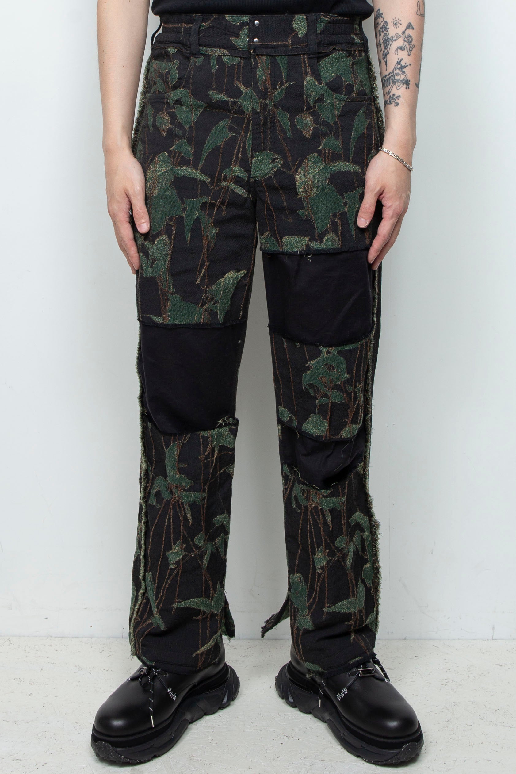 今作のジャガードは洗いと経年変化によって蔦を浮き上がらせるというコンセプトのもと作成しました。ジャガード織機にて、縦糸にポリエステル、緯糸にコットンとポリウレタンを使用し、ポリウレタン糸であるマルロン糸を蔦柄の部分だけ 下に潜らせる(裏に忍ばせる)織り方で制作することにより、蔦部分だけが収縮しやすい仕組みとなっており、その原理にさらに洗いを加えること で蔦がボコボコと浮かび上がってきます。