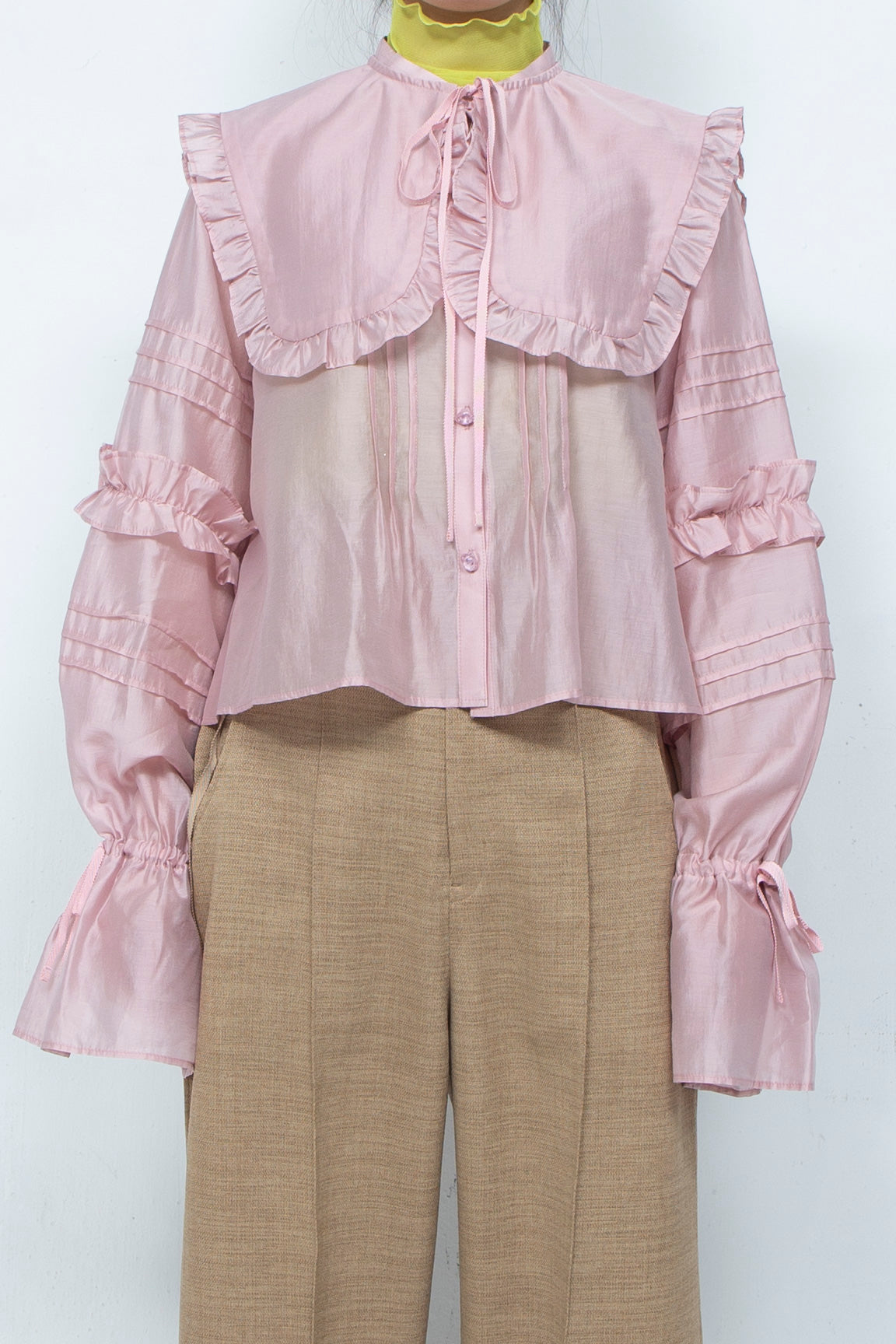 3Dボタン2WAYリンクルタックフリルブラウス (プリント)