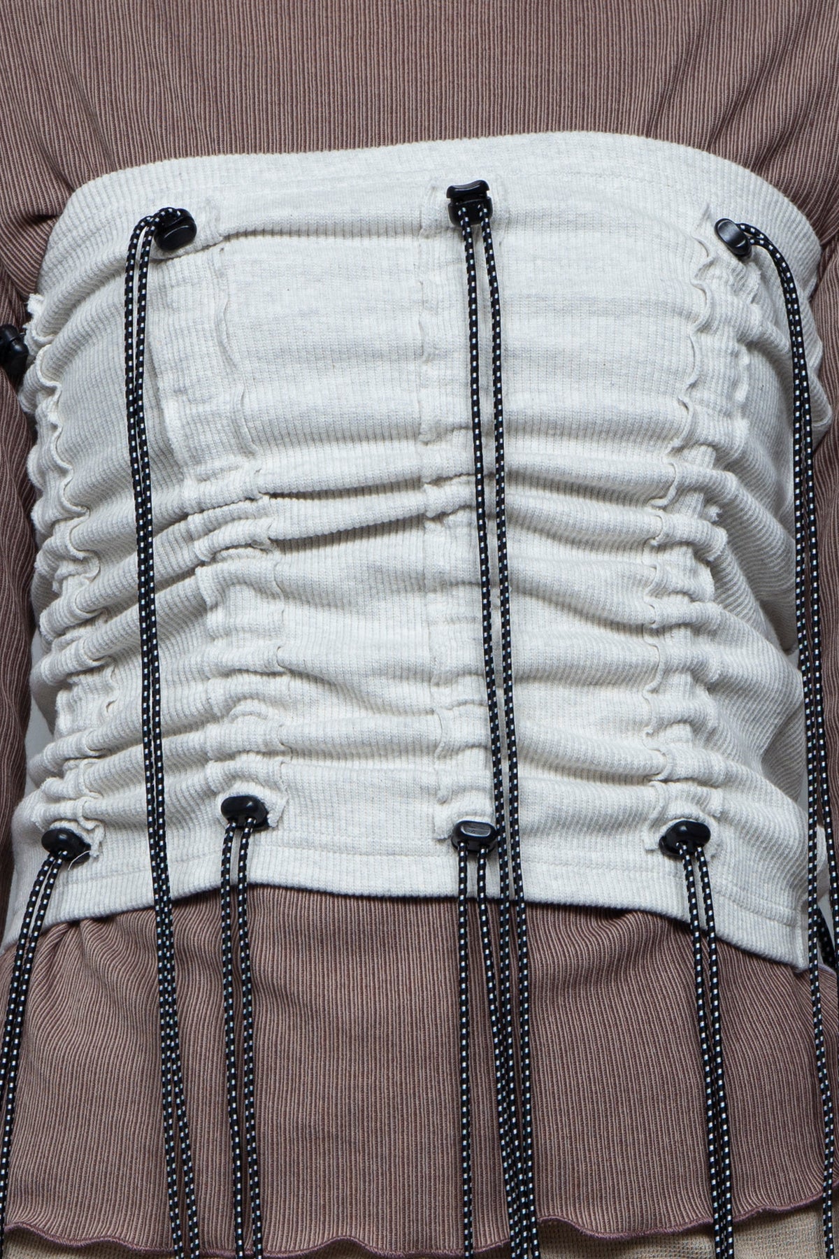前面にドローコードを配したチューブトップ。絞ることでシルエットや長さ調整が可能で、一枚でスタイリングのアクセントになるアイテムです。