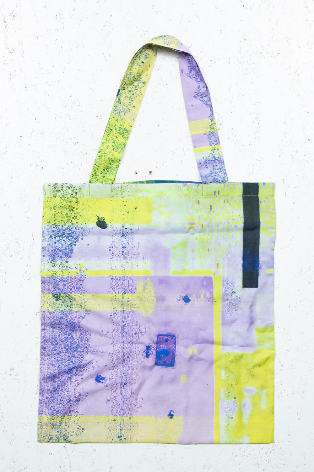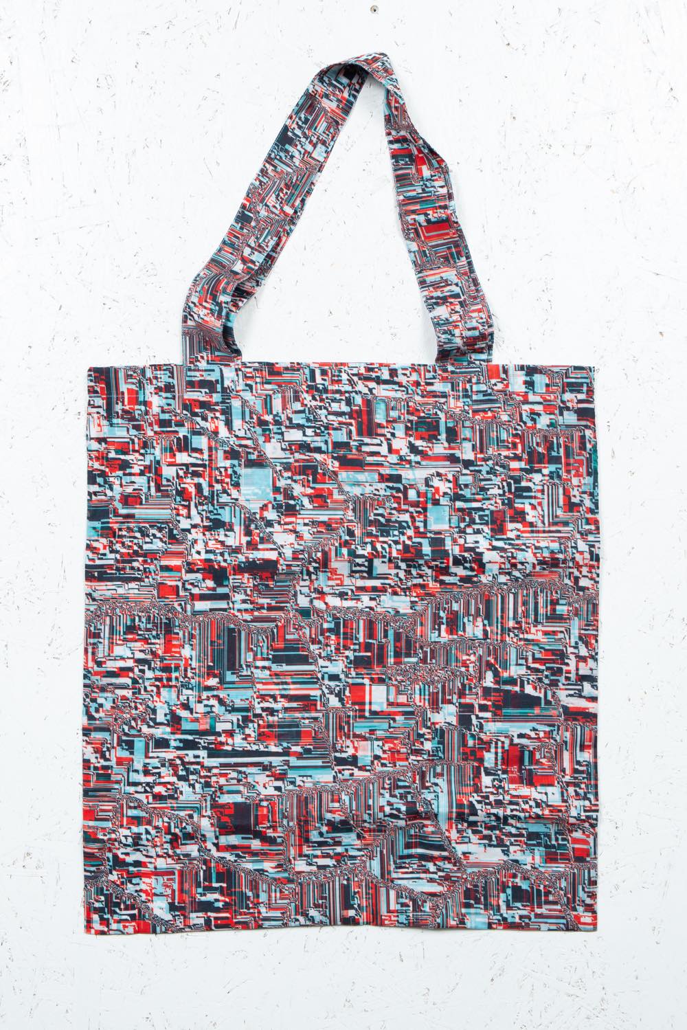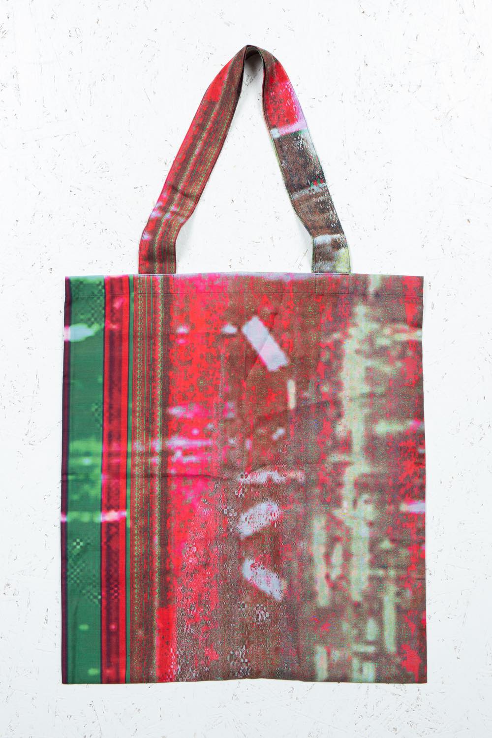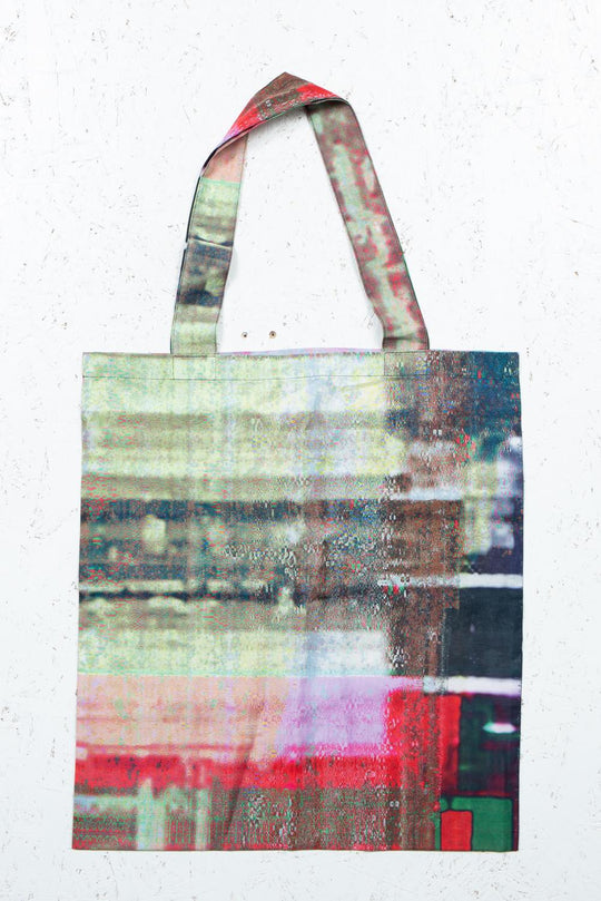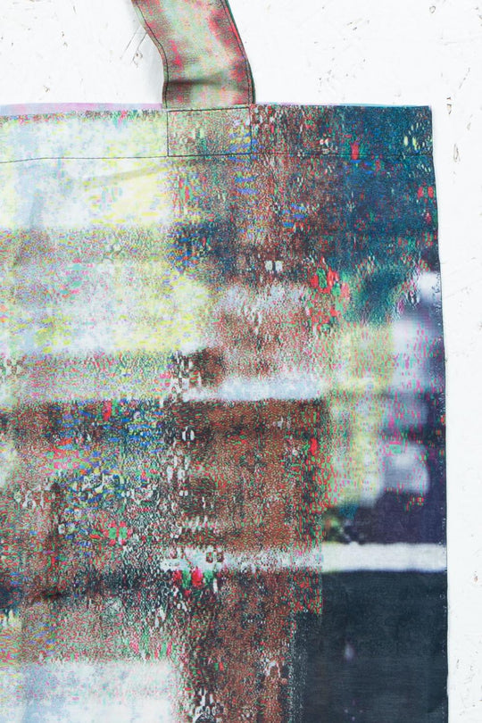 カガリユウスケが撮影した壁写真の中から厳選したものを、アーティストUc Nv がグリッチ化したグラフィックのトートバッグ。