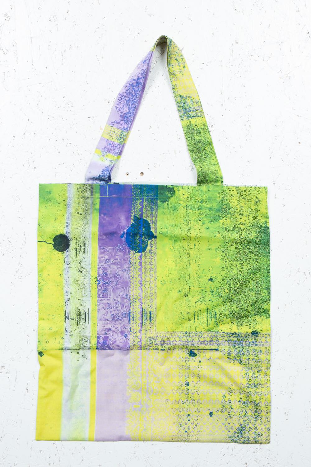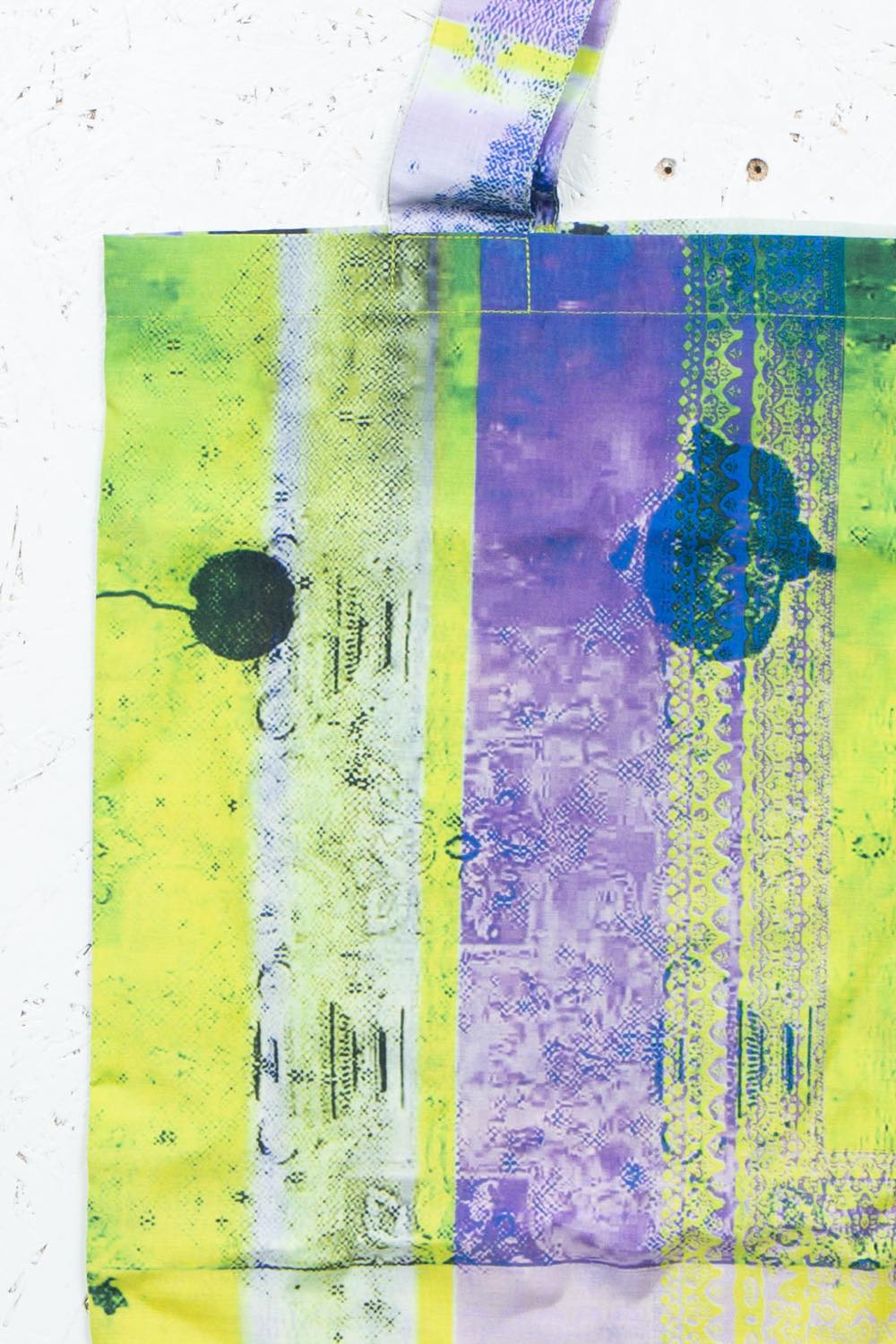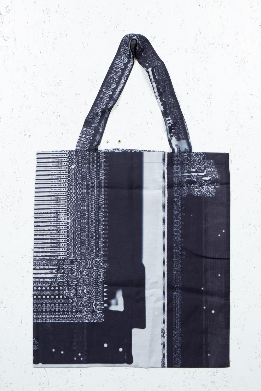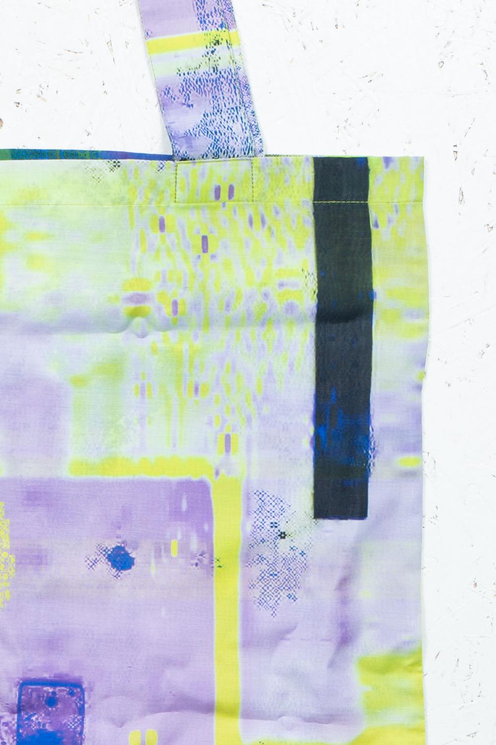 カガリユウスケが撮影した壁写真の中から厳選したものを、アーティストUc Nv がグリッチ化したグラフィックのトートバッグ。