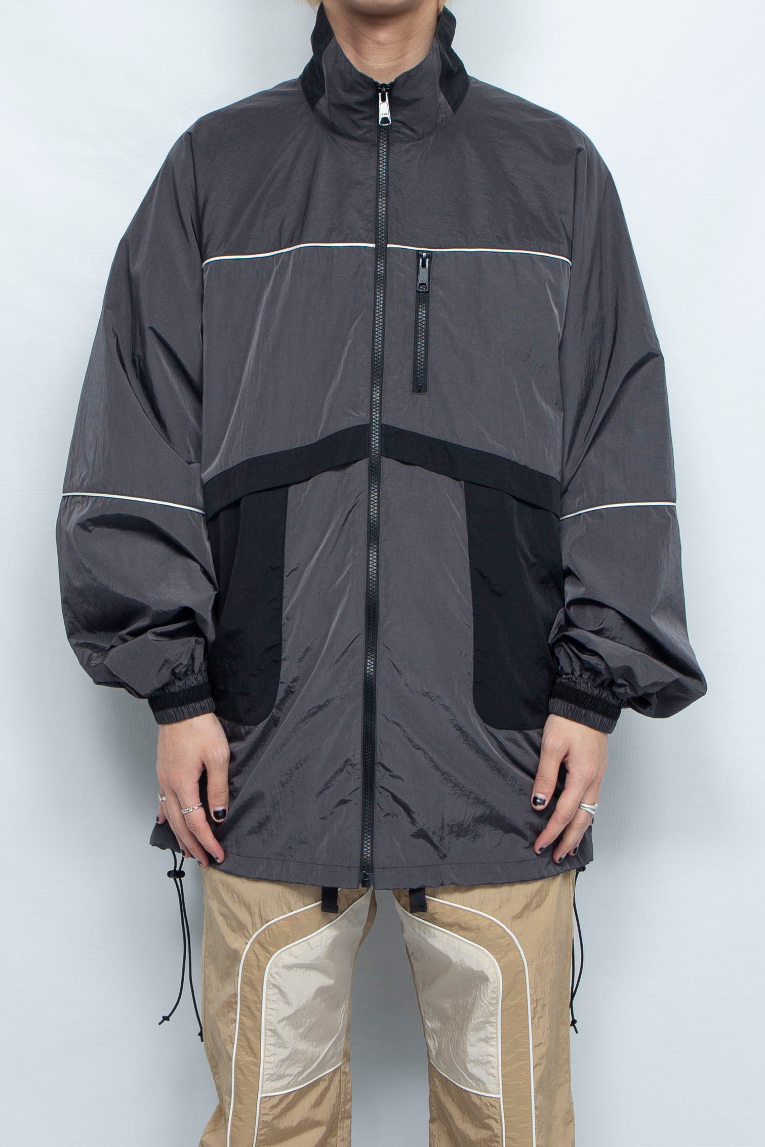 ナイロン素材のラインパンツ。素材の切り替えに合わせた丁寧なパイピングがポイント。