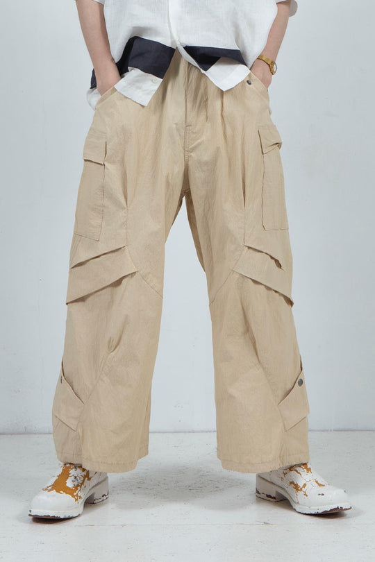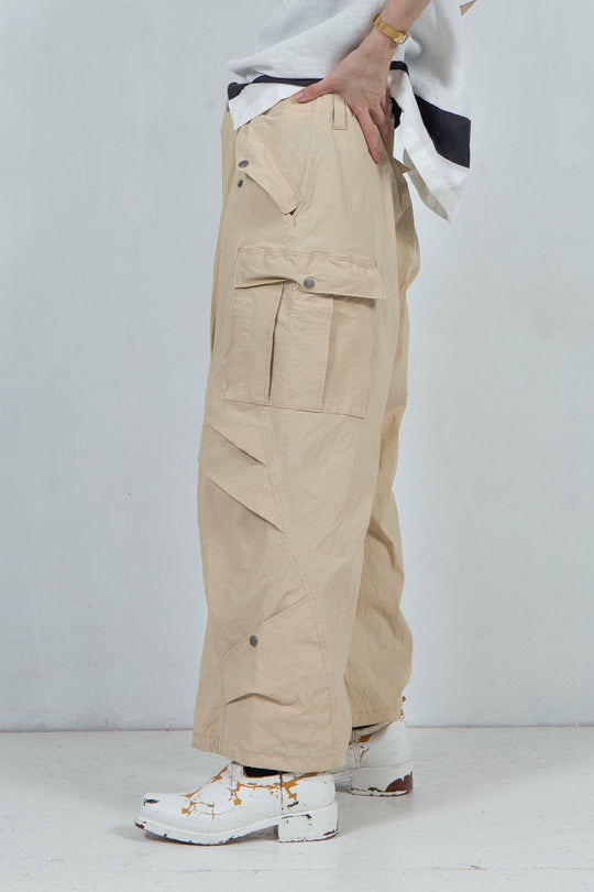極太のワイドカーゴパンツ。ウエストと裾にドローコードが入っており、サイズやシルエットの調整が可能です。