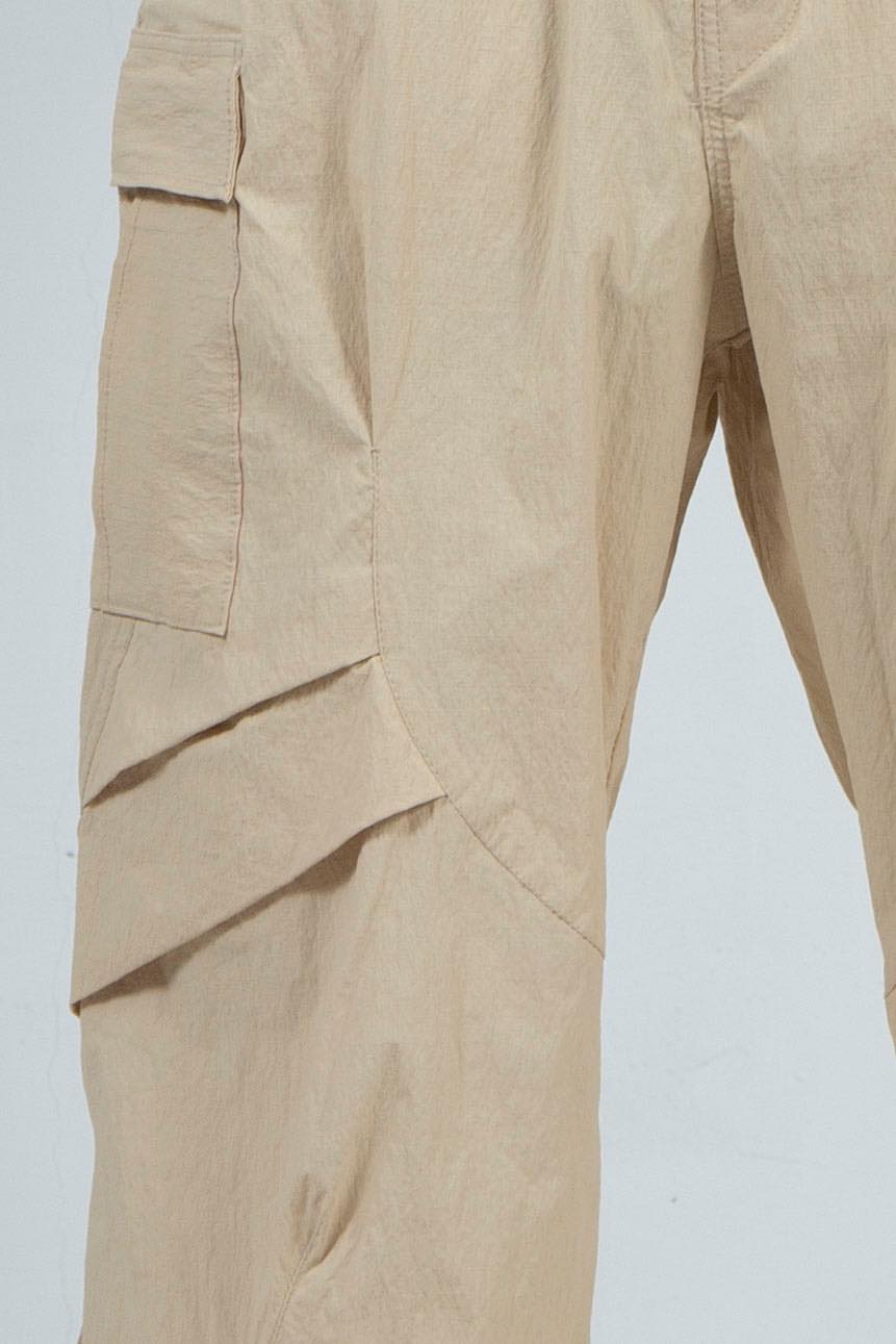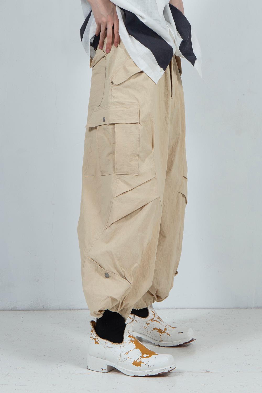 冒険家が草むらをかき分けて進む姿からカーゴパンツを連想し、ディテールの着想を得たアイテム。島の形をシーチングに写し、その立体裁断から作られた前身頃のダーツや曲線の縫い目、プリーツや裾口のポケットが特徴です。
