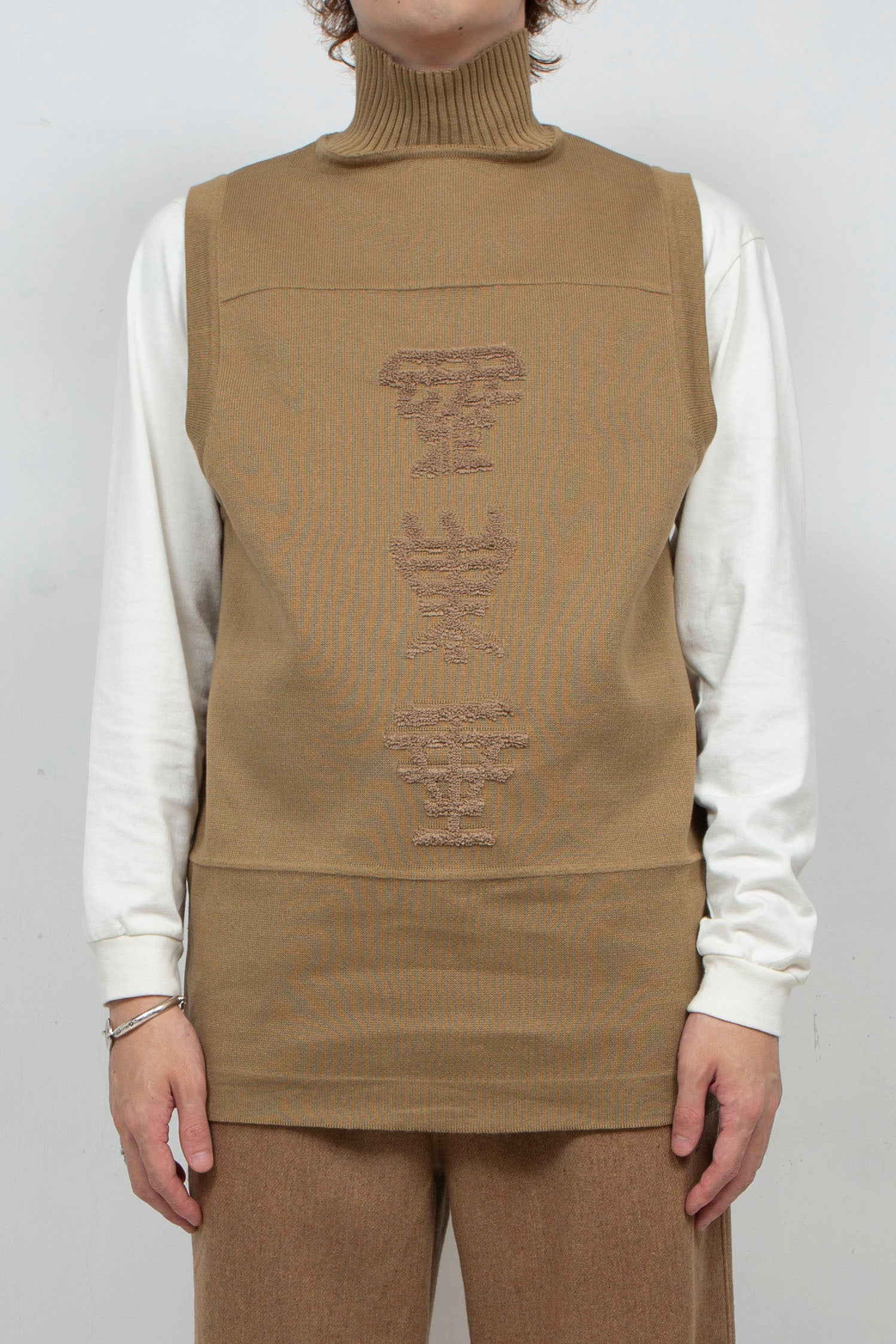 This knit vest is inspired by a hanging scroll, with the letters ``RASTA'' made three-dimensional by pile knitting.