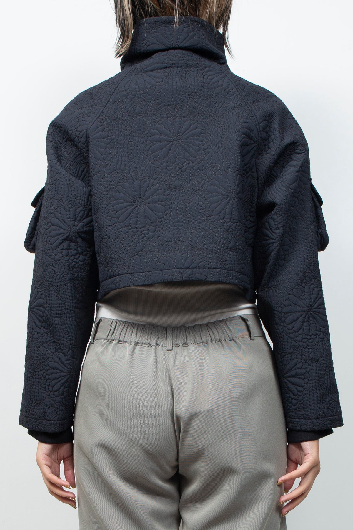 菊の花をモチーフにデザインしたオリジナルのキルティング生地と、同じくオリジナルでデザインした3Dプリントボタンを使用したクロップドジャケットです。