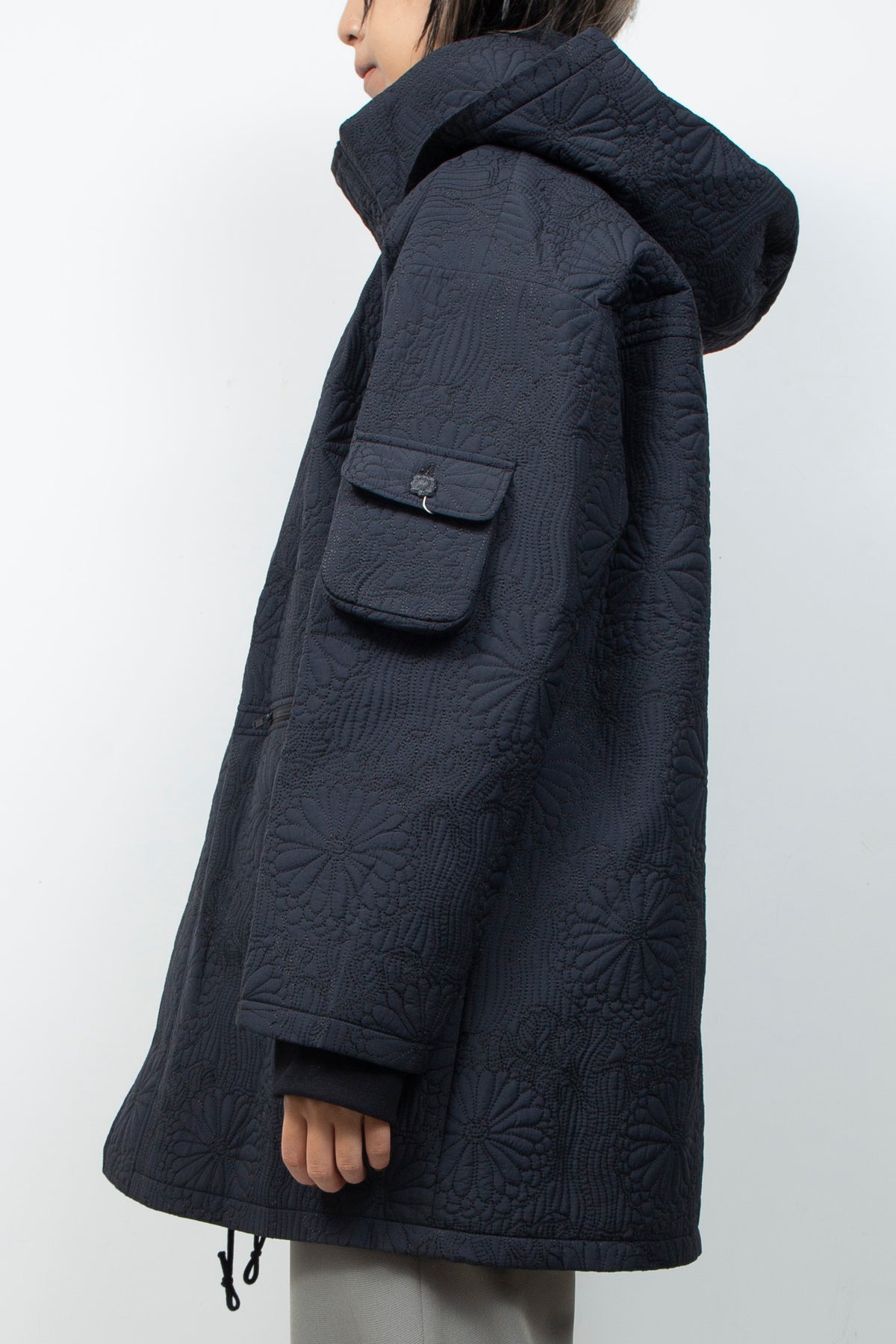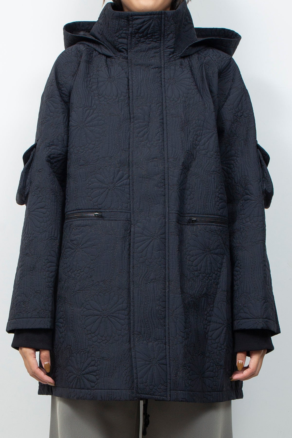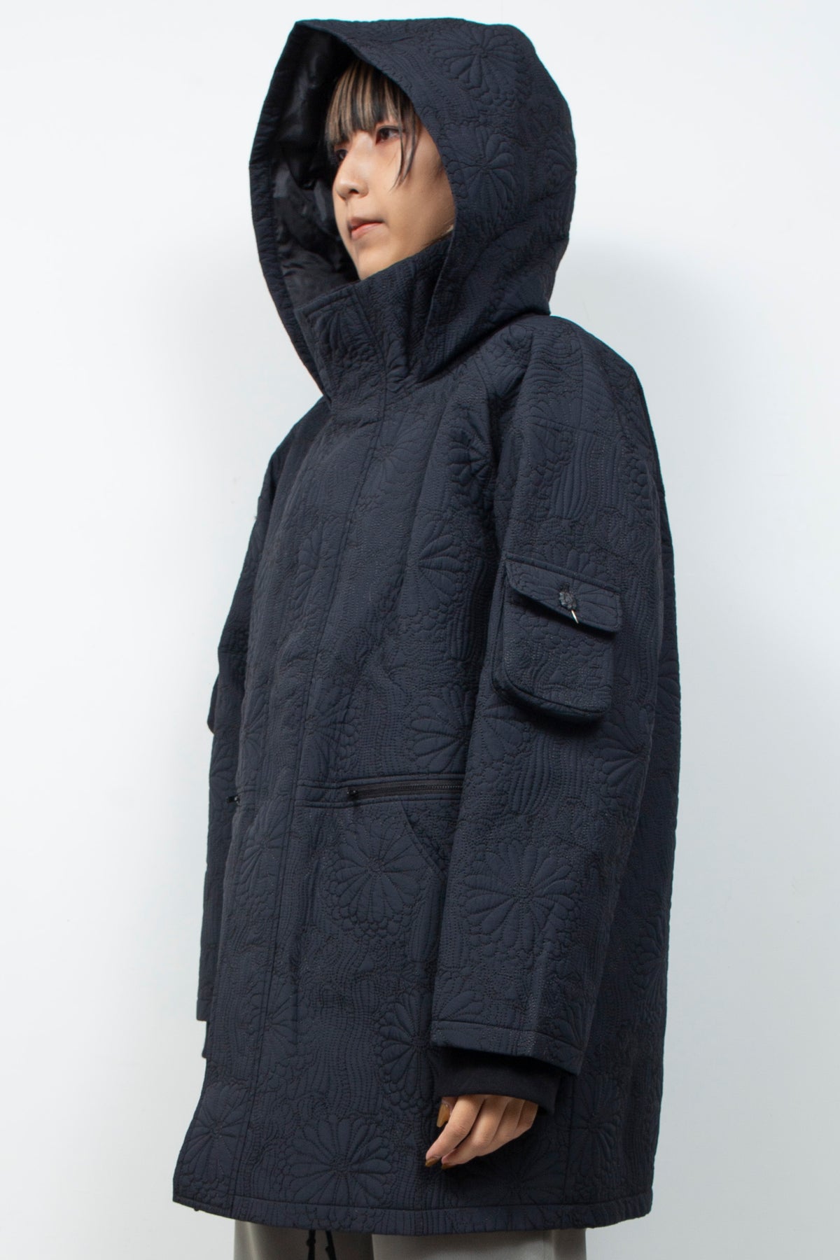菊の花をモチーフにデザインしたオリジナルのキルティング生地と、同じくオリジナルでデザインした3Dプリントボタンを使用したユニセックスジャケット。