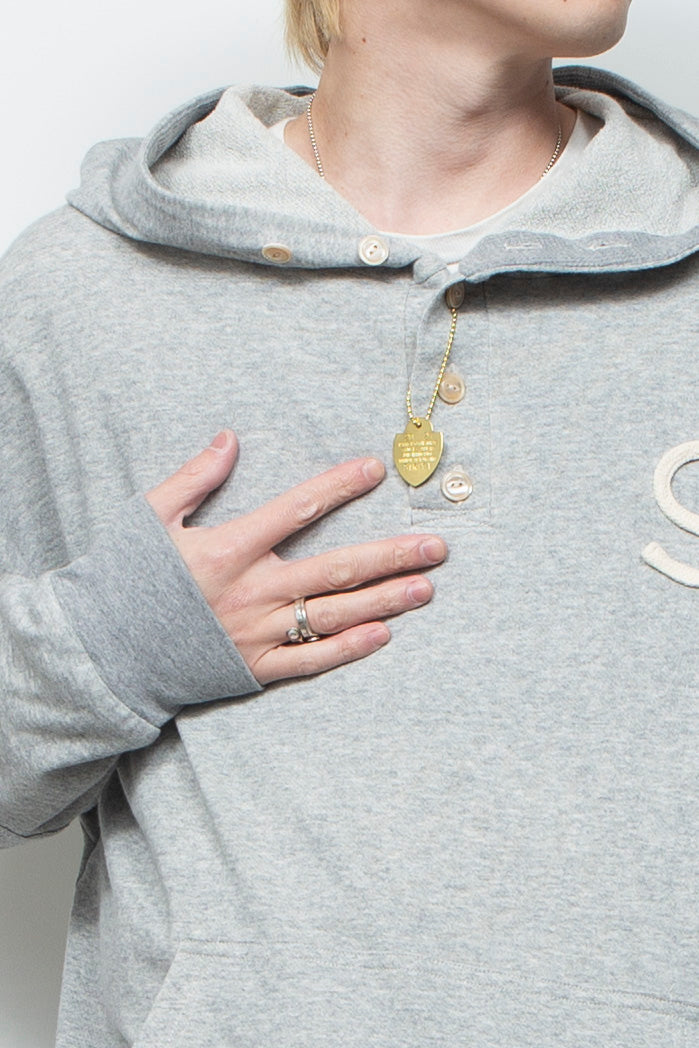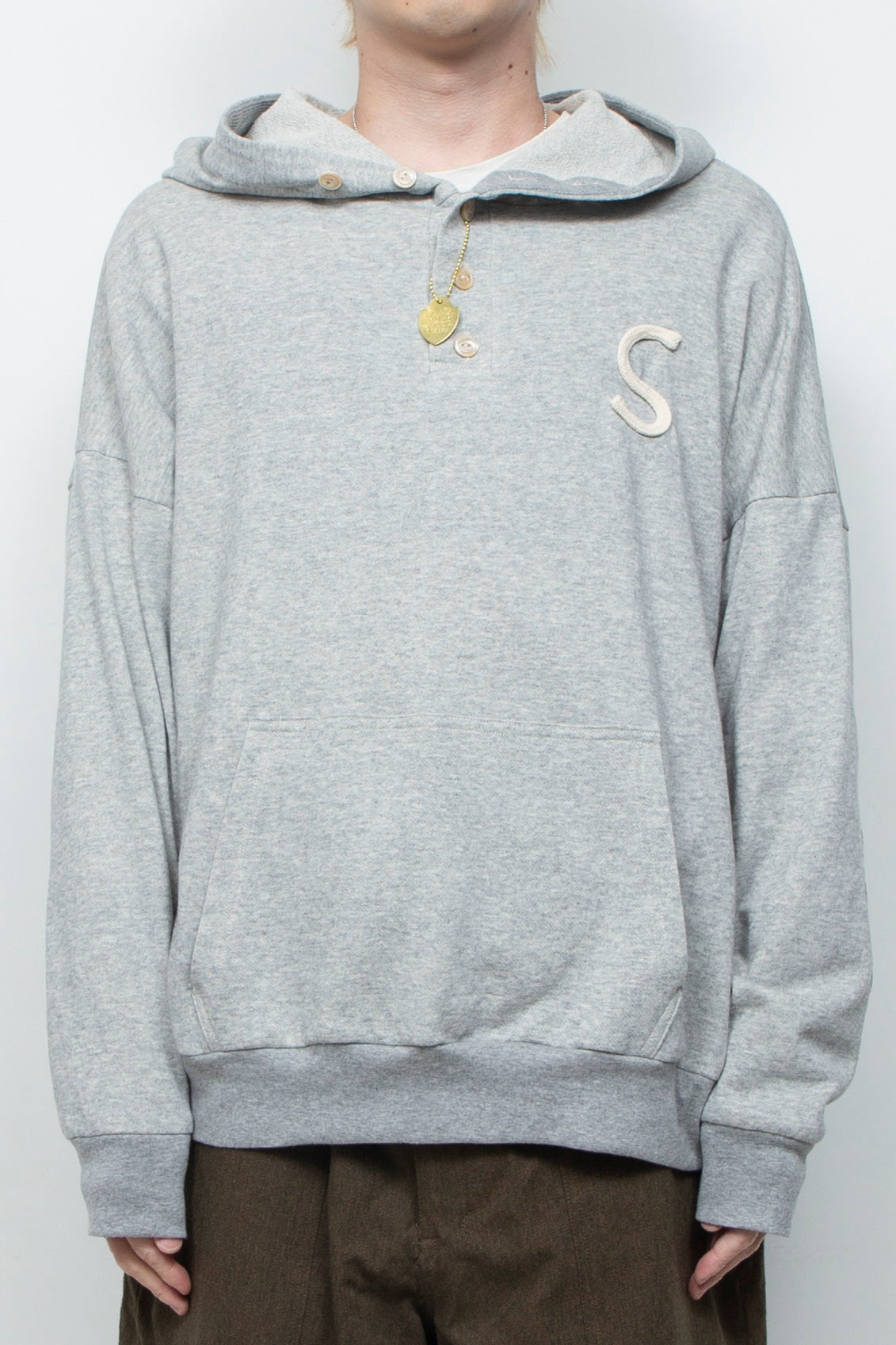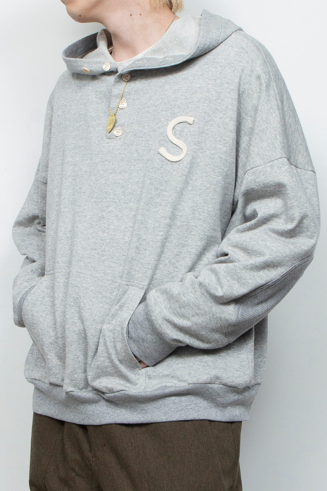 襟元のボタンがカジュアルな中に上品さをプラスし、スタイリングの幅も広げるデザインです。ワッフル素材のエルボーパッチや、ロープで施した「S」もアクセント。