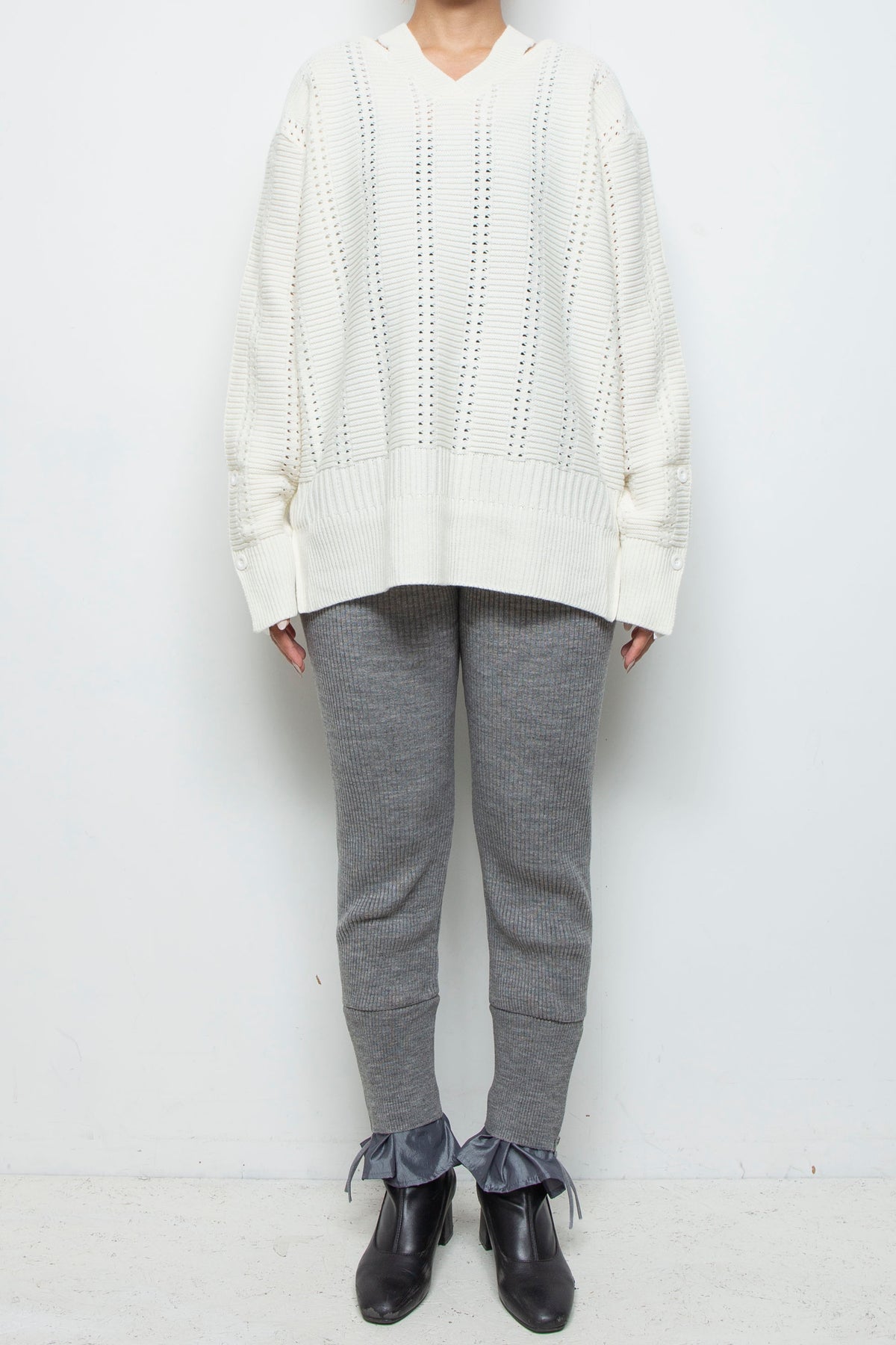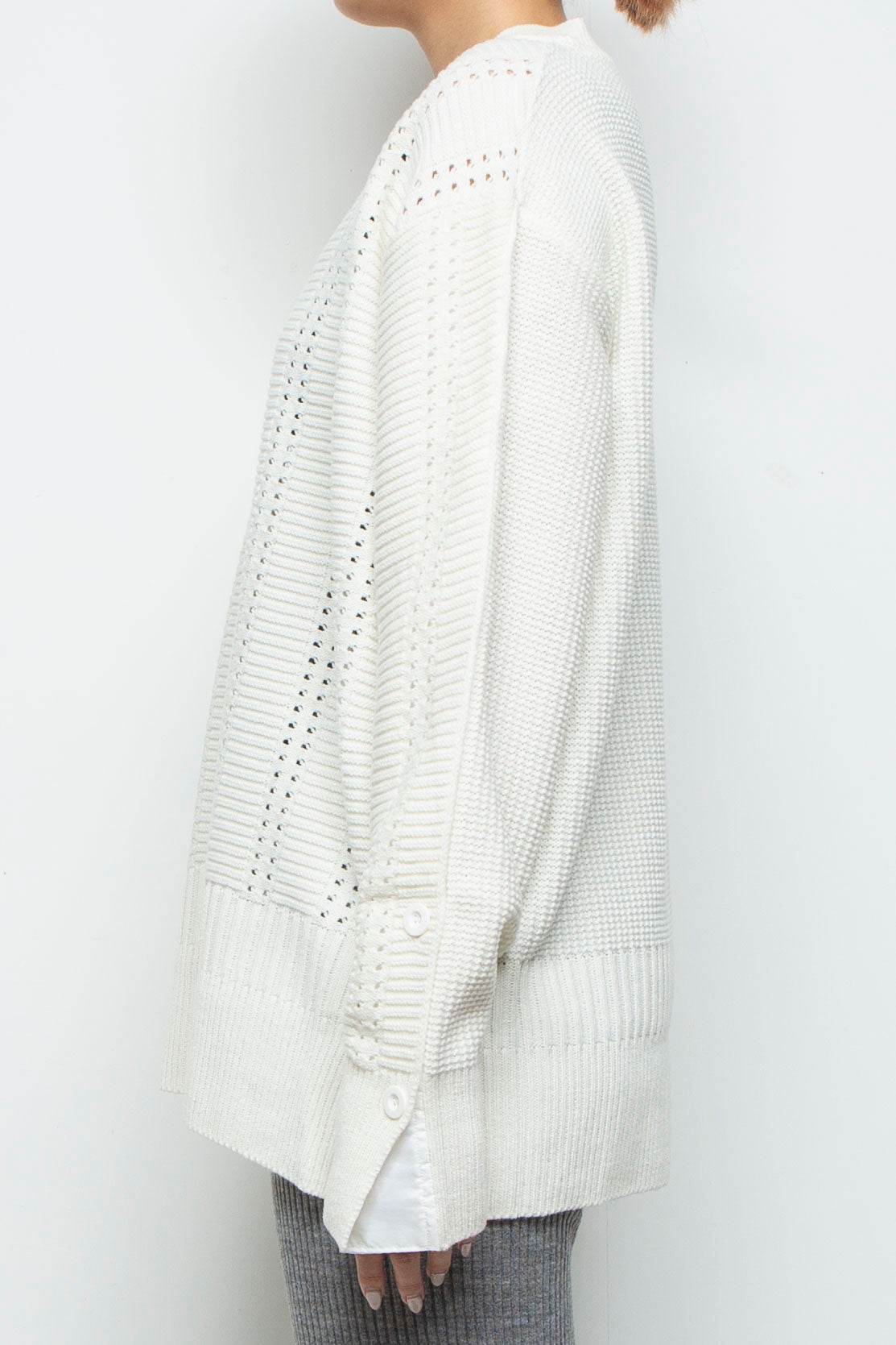 袖の切り替えが特徴的なボタンでスリットが開閉できるニットトップス。