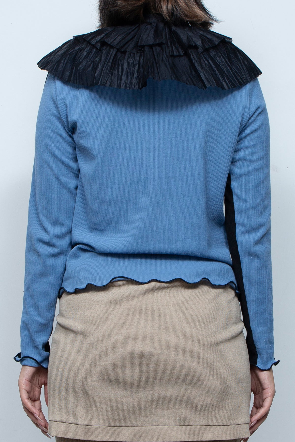 プリーツのフリルで蝶をイメージしたつけ襟。シャツライクなデザインで前見頃はボタン仕様。