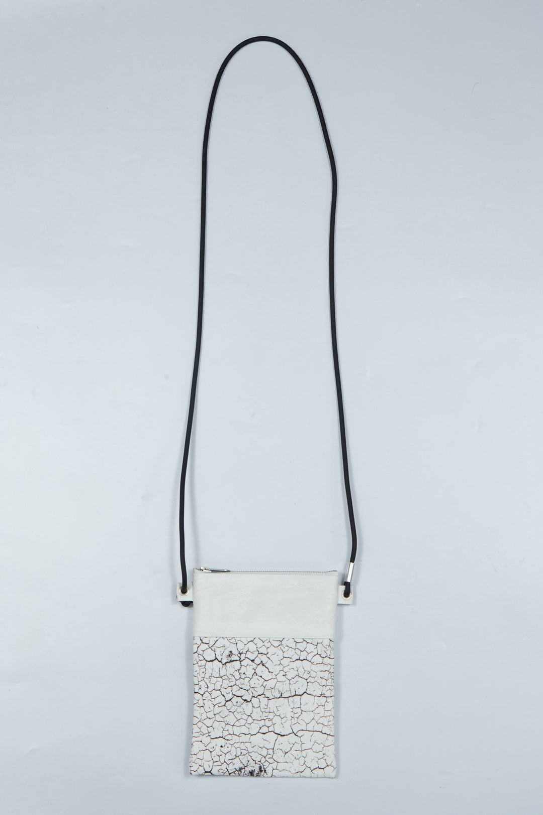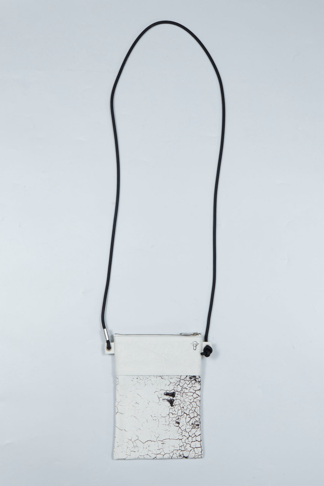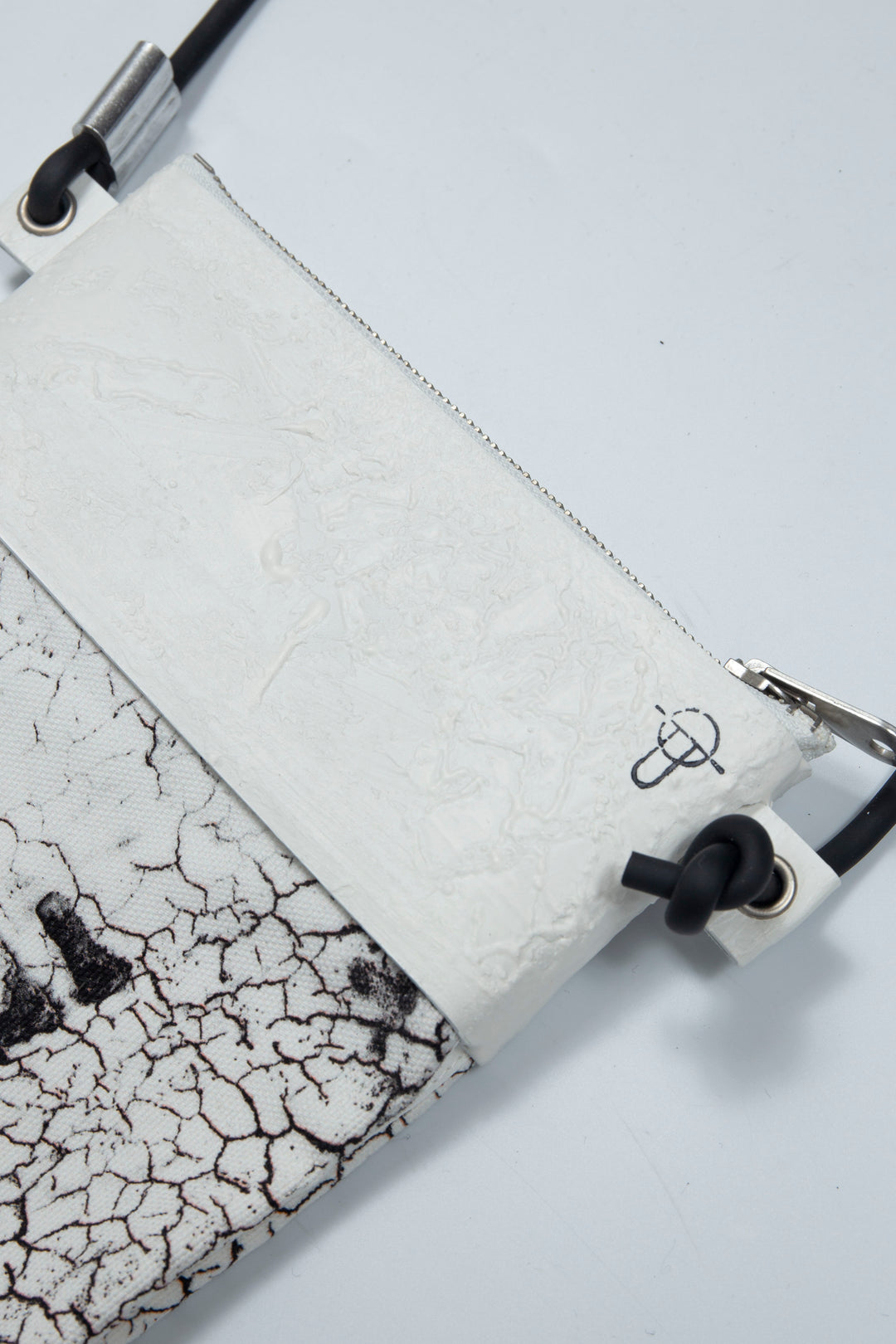 カガリユウスケが撮影した壁写真を綿100%のキャンバスに昇華転写プリントした生地とパテ革を組み合わせたサコッシュ。