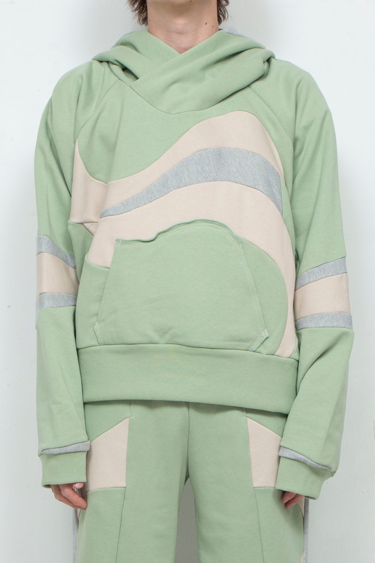 人工的な曲線を思わせる多数の切替デザインが特徴で、前身頃、袖、フード、また背中にも曲線的な切替で未来的なイメージに。