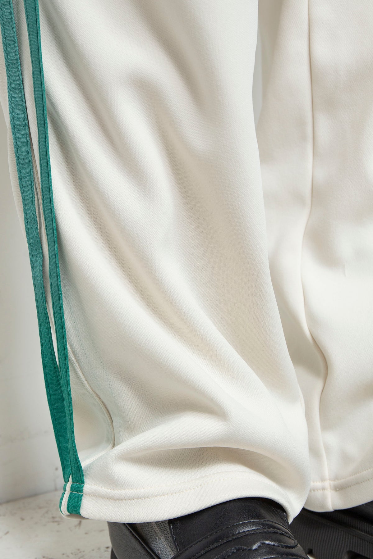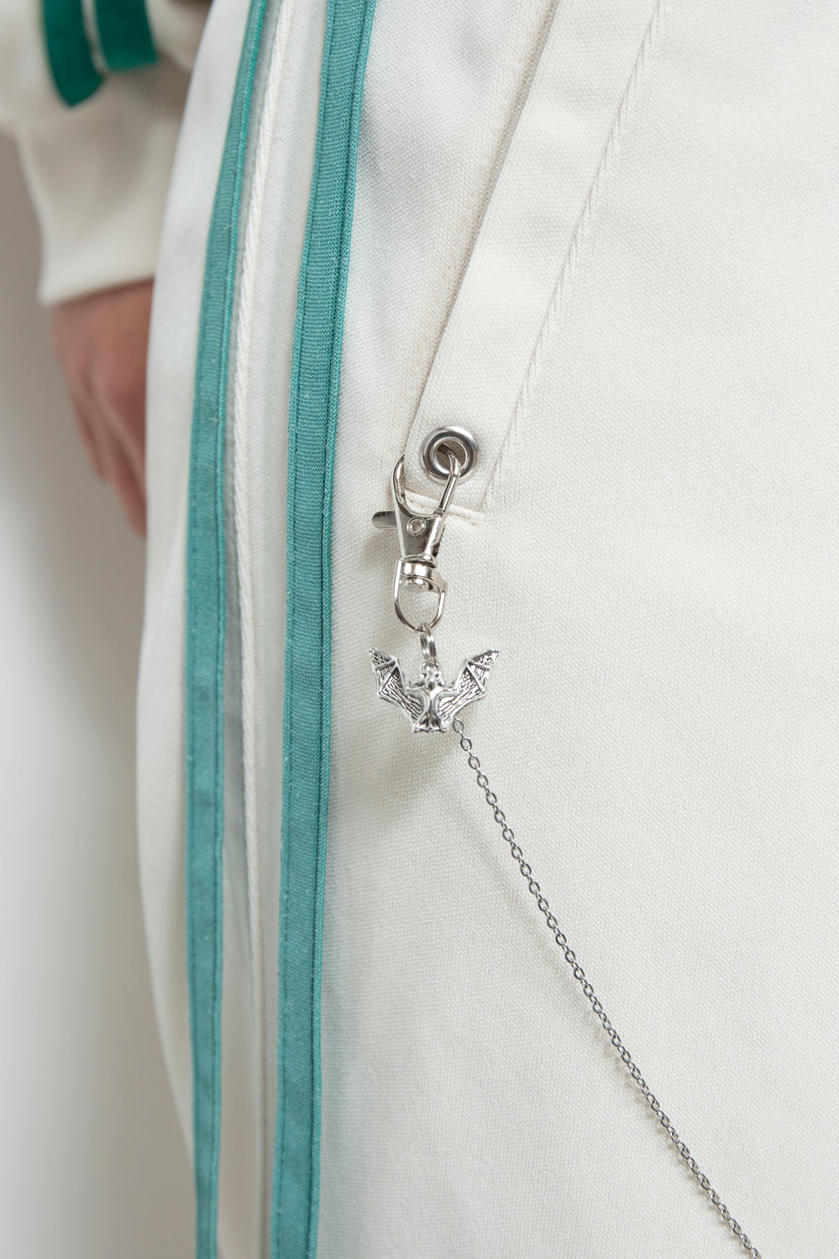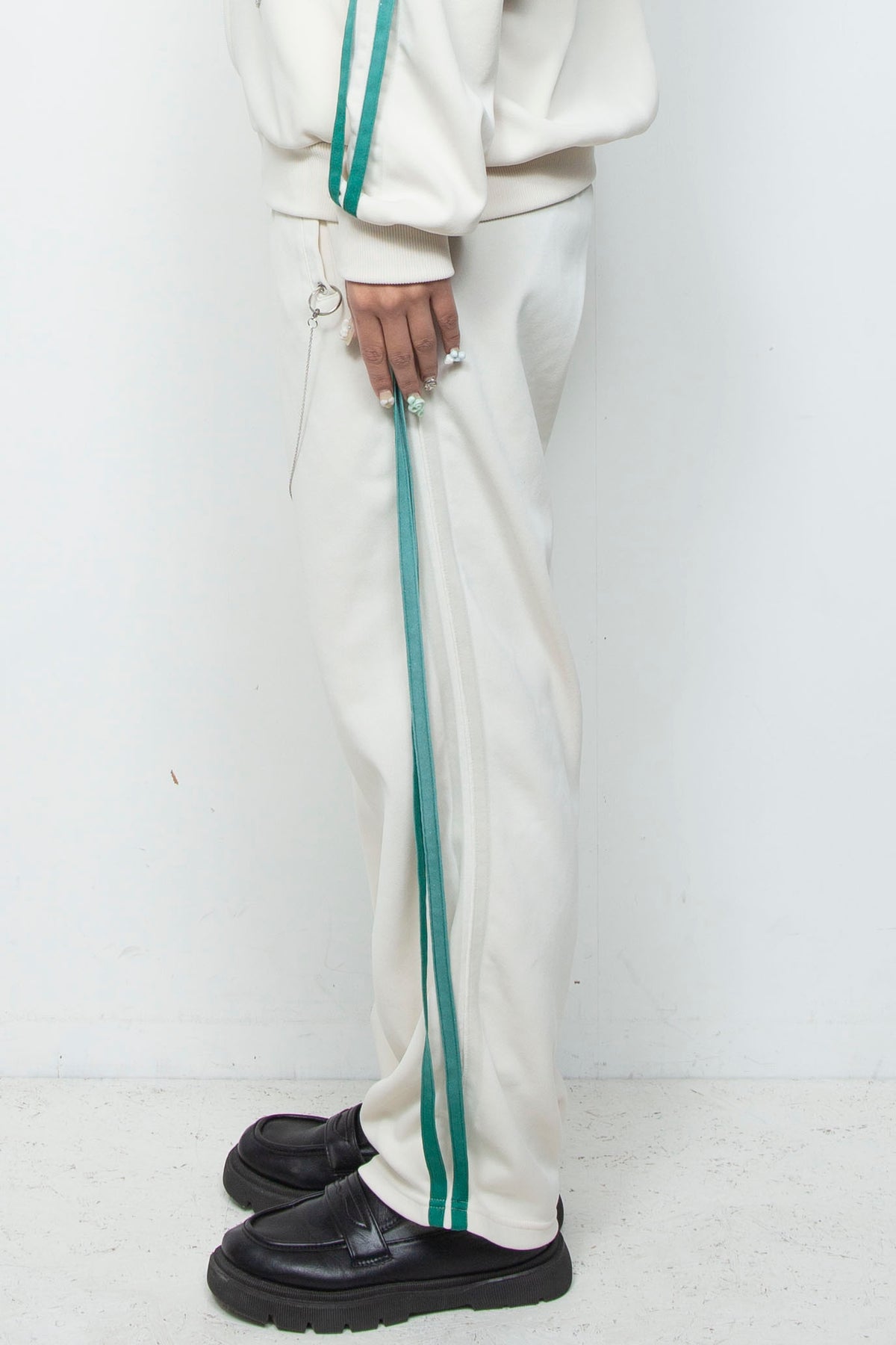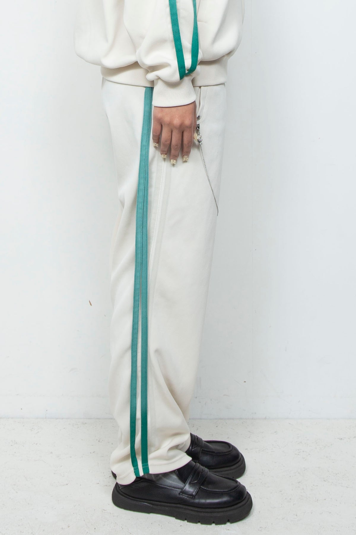 まるで靄(もや)がかかったかのような、独特のフェード感が魅力のトラッ クパンツ。一点ずつエアブラシで丁寧に顔料をスプレー染めすることで、他 にはない唯一無二の表情を生み出しています。均一ではない、手作業ならで はの色の揺らぎと、ランダムに配されたネックレスパーツが、あなただけの スタイルを際立たせます。ストリートでも、日常でも、見る人の目を惹きつ ける特別な一着です。