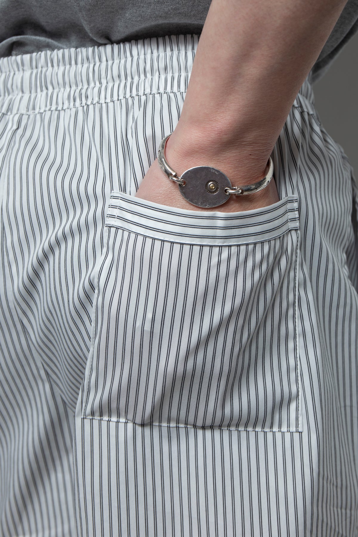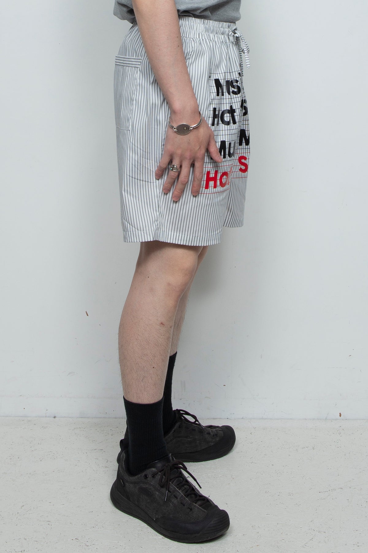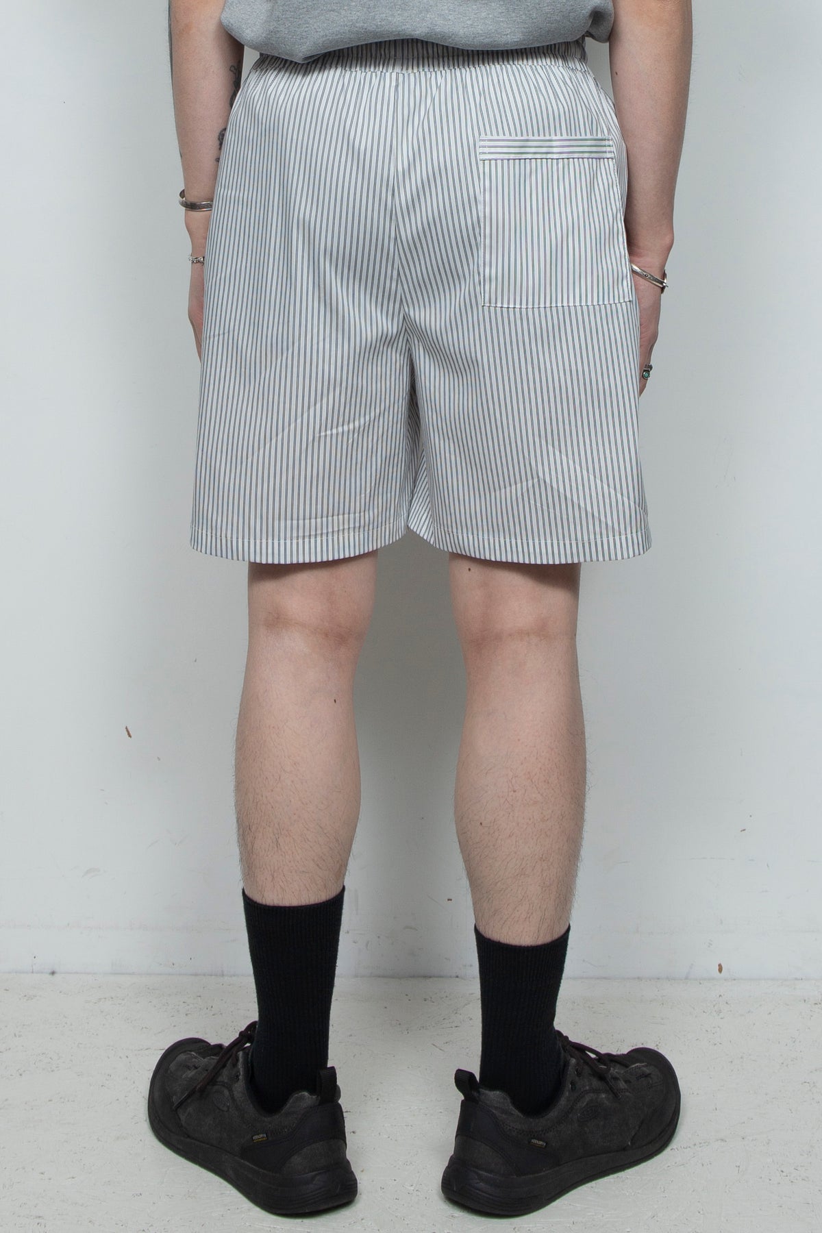 黒と白のピンストライプのプリントショーツ。