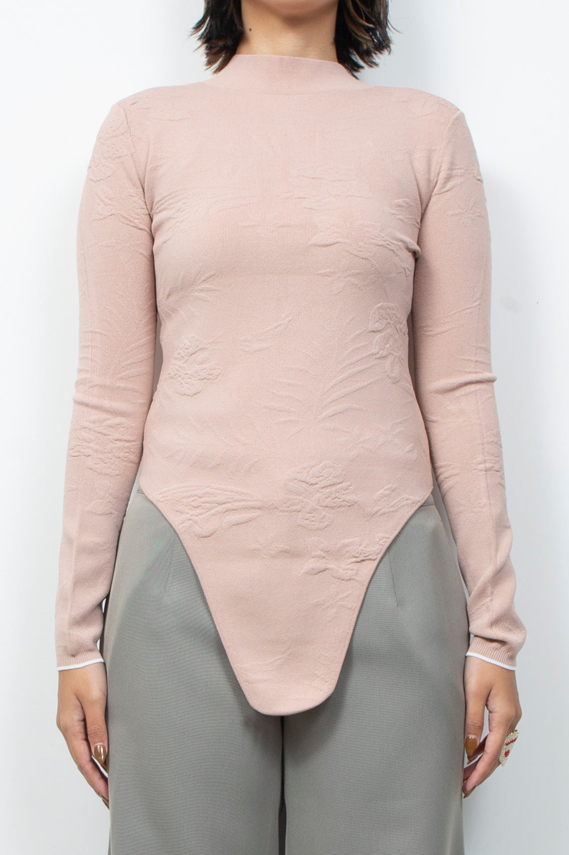 後どちらでも着用いただける2wayのボディースーツ。立体的なボタニカル柄のニットで、わずかなモックネックや袖の配色変えで上品な印象に。
