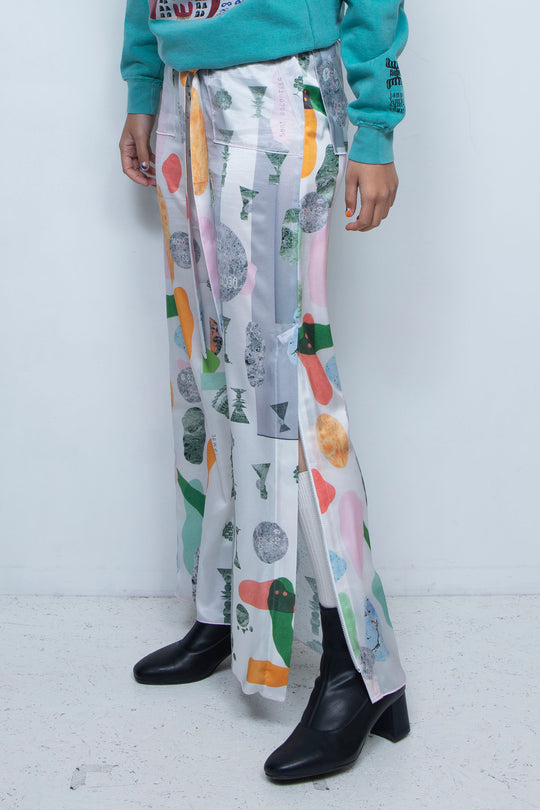 シルクのようなタッチと落ち感でシルエットが美しい、ポリエステル素材のパジャマ風シルエットのボトム。